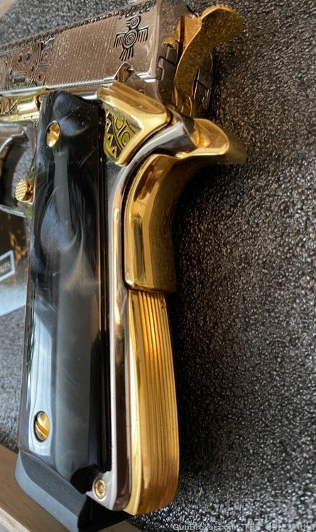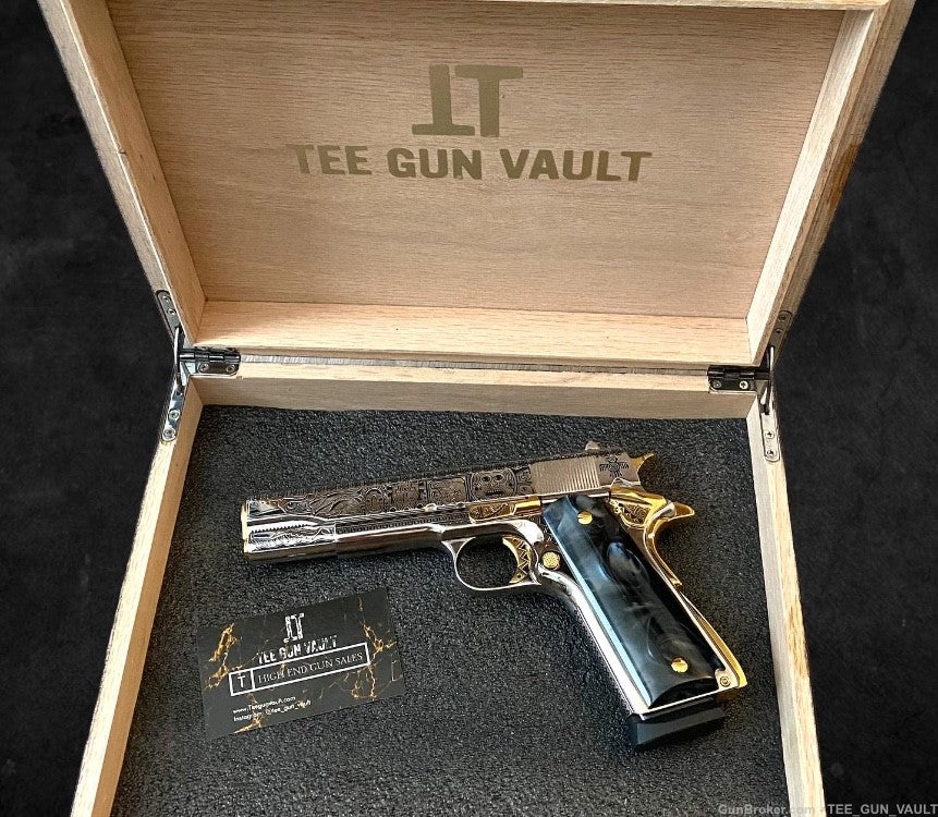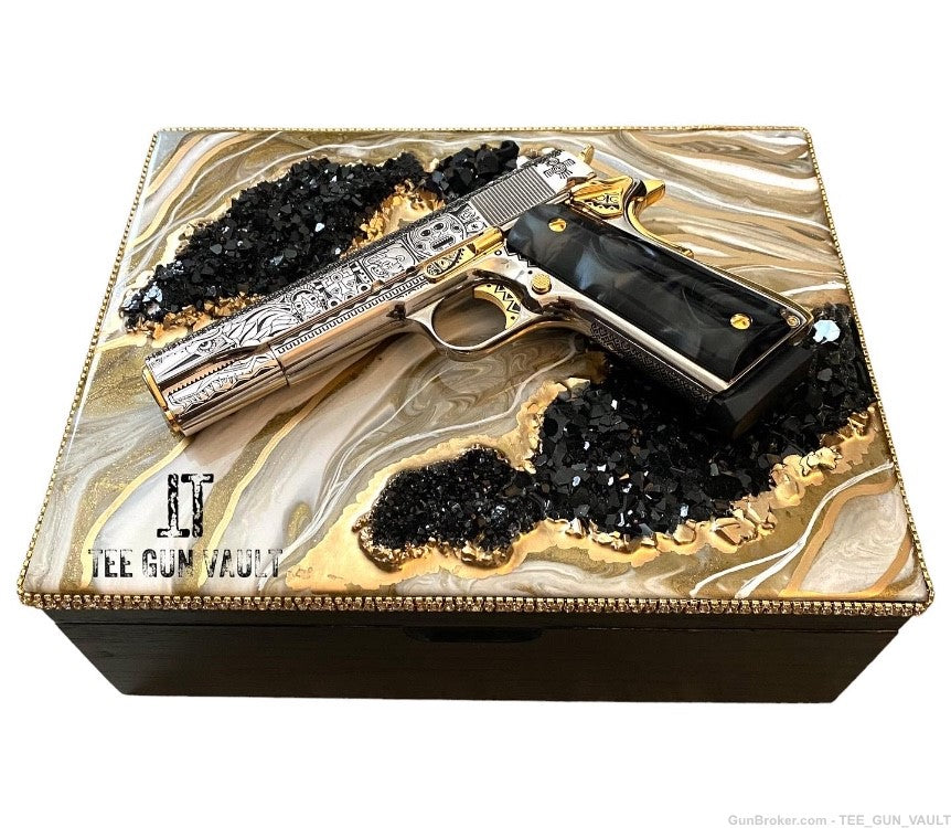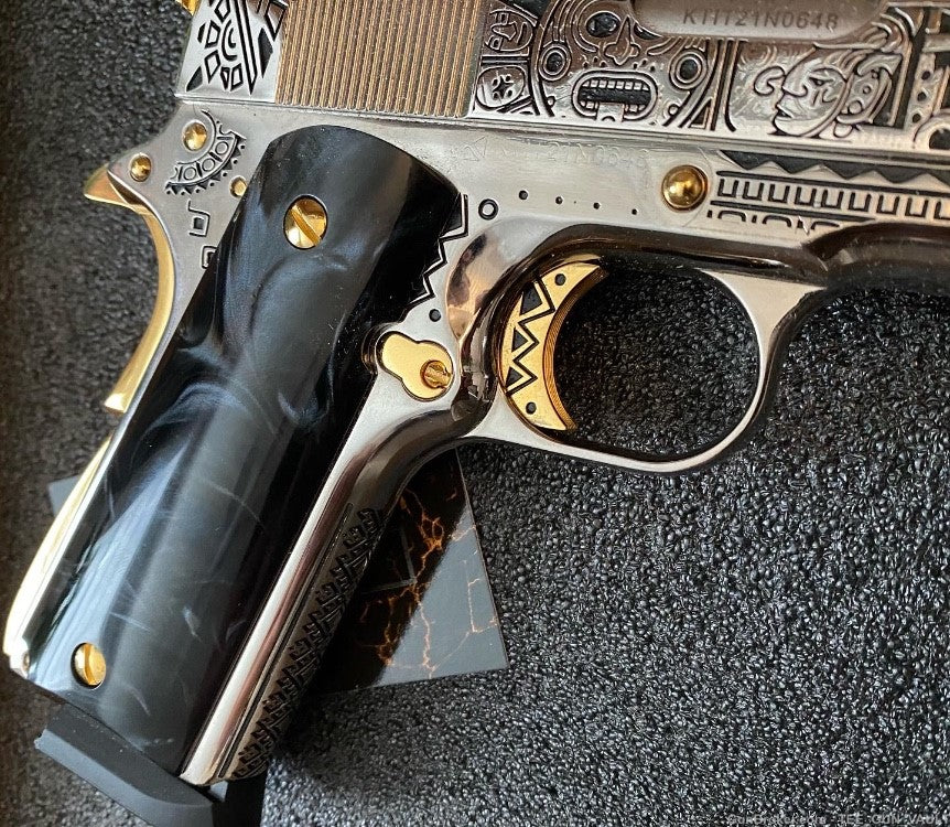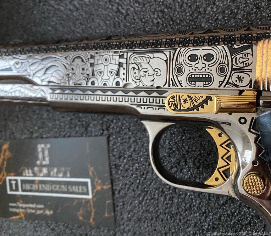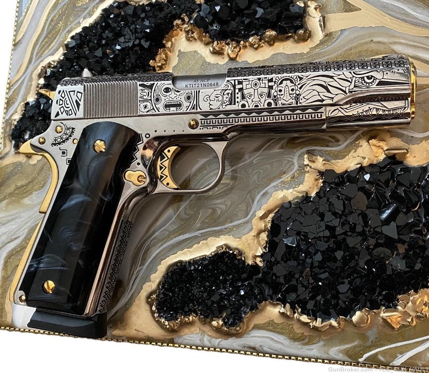 A SIMPLE 1911 pistol with sophisticated gun art work.