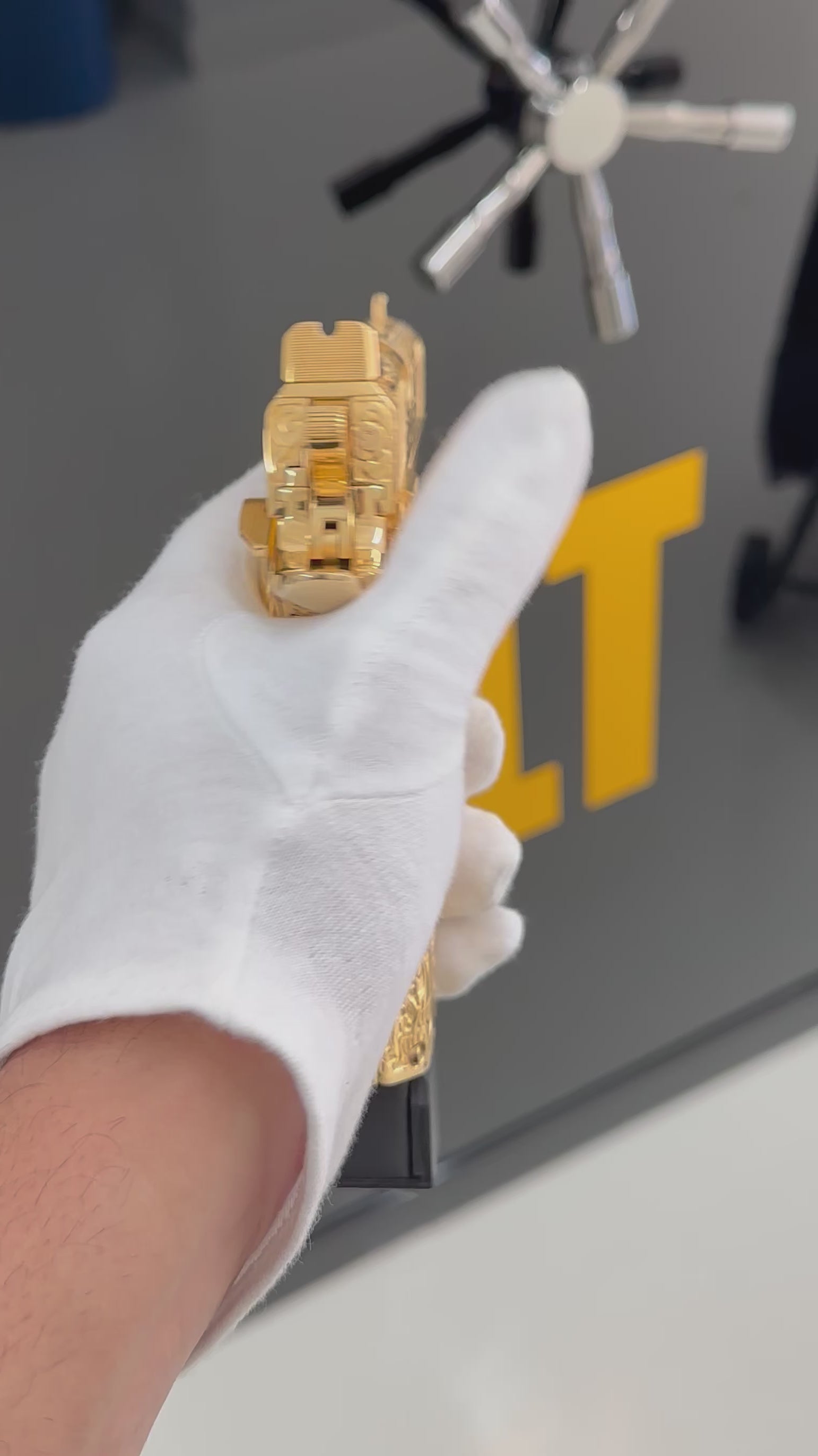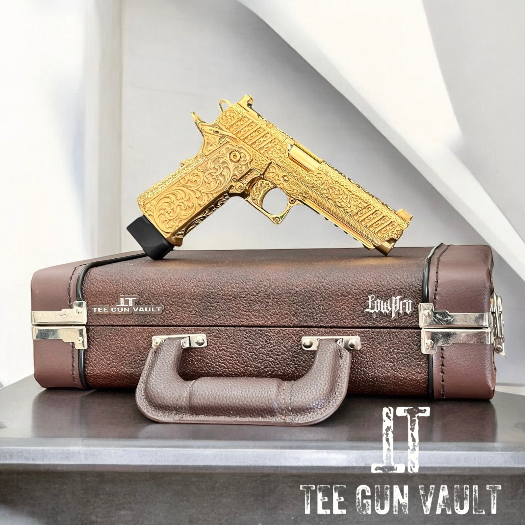 FULLY ENGRAVED POLISHED AND 24K GOLD PLATED WITH MATCHING METAL GRIPS AND A DRAGON SCALE POLYMER GRIP.