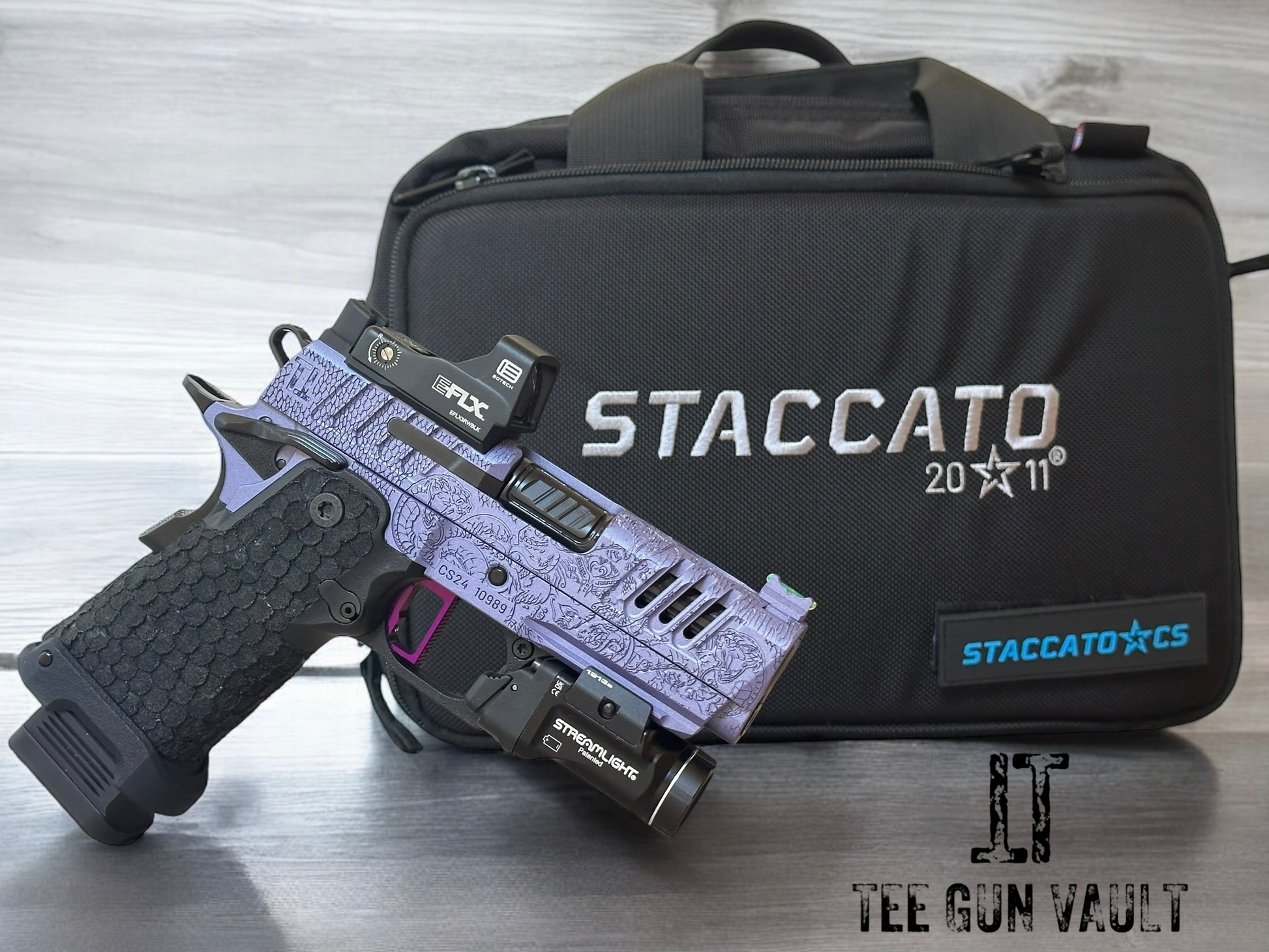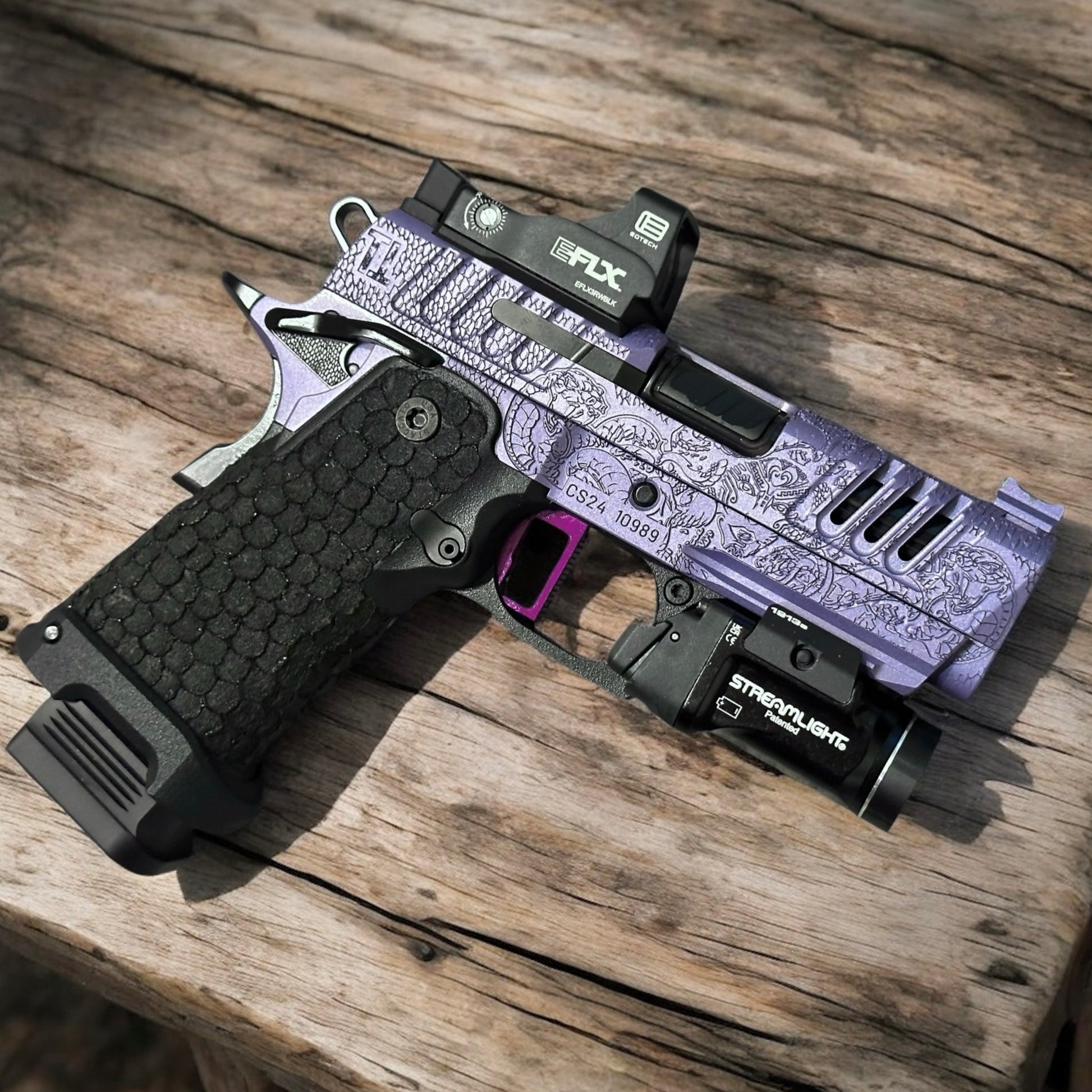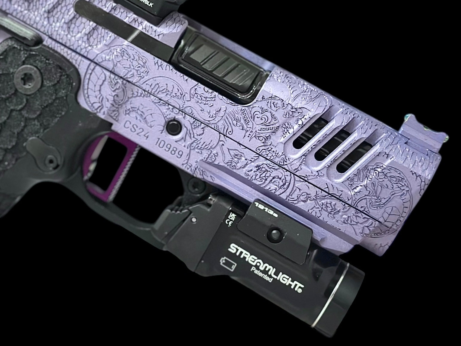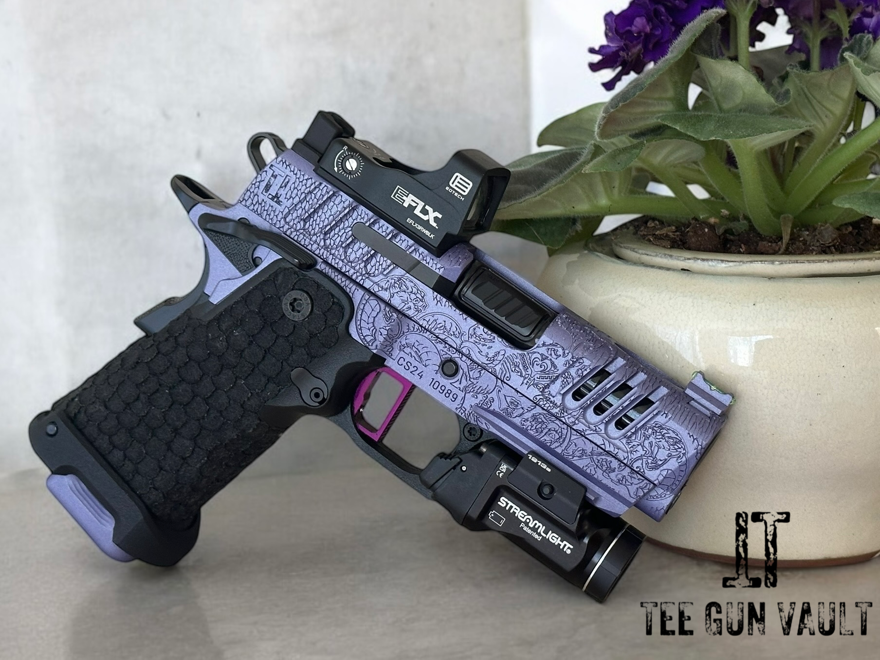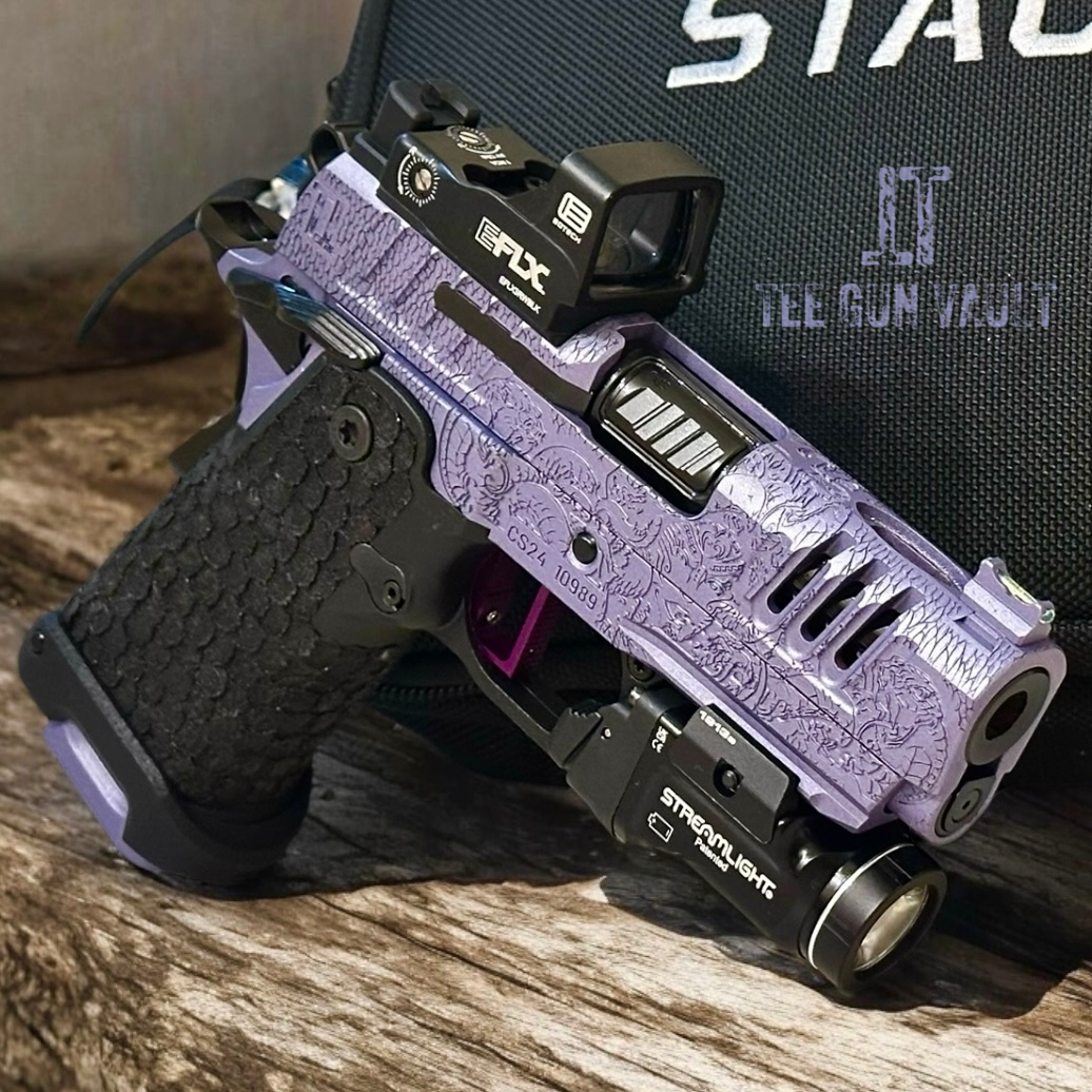 STACCATO CUSTOM CS X SERIES 3.5” PORTED BARREL “MEDUSA” ENGRAVED IN PURPLE/BLACK FINISH.