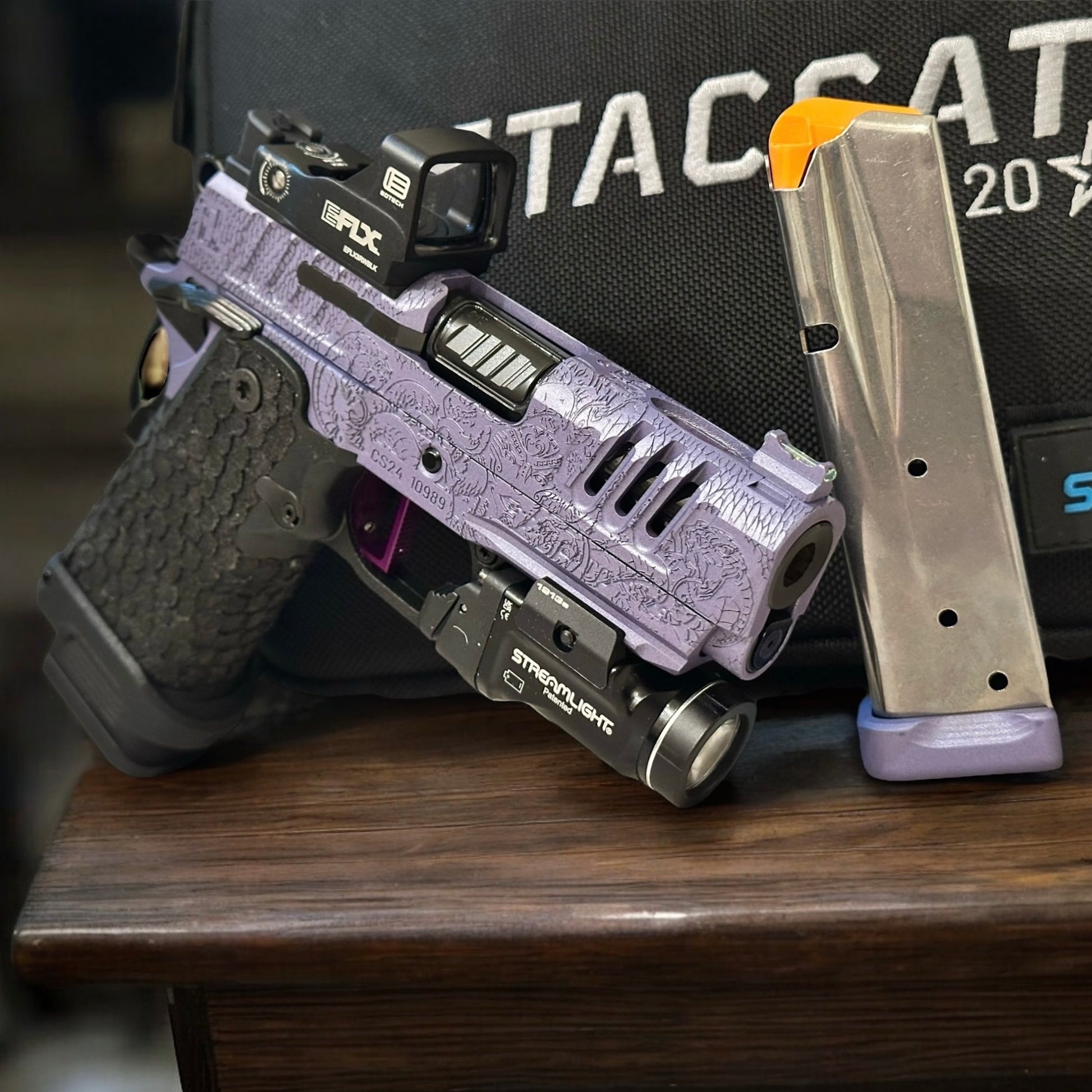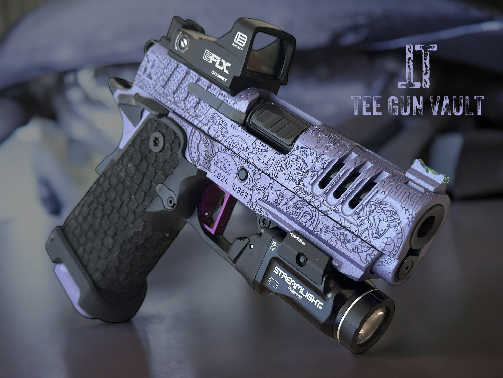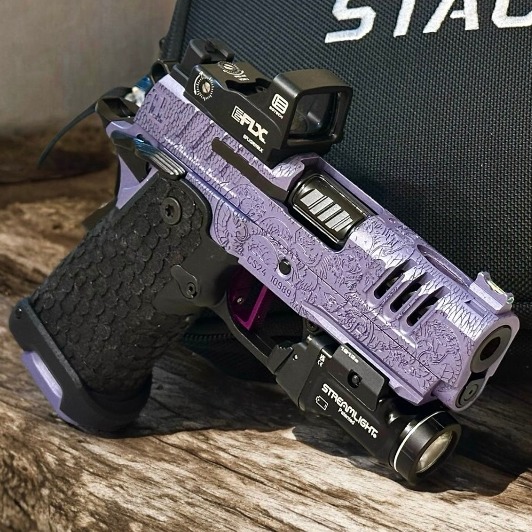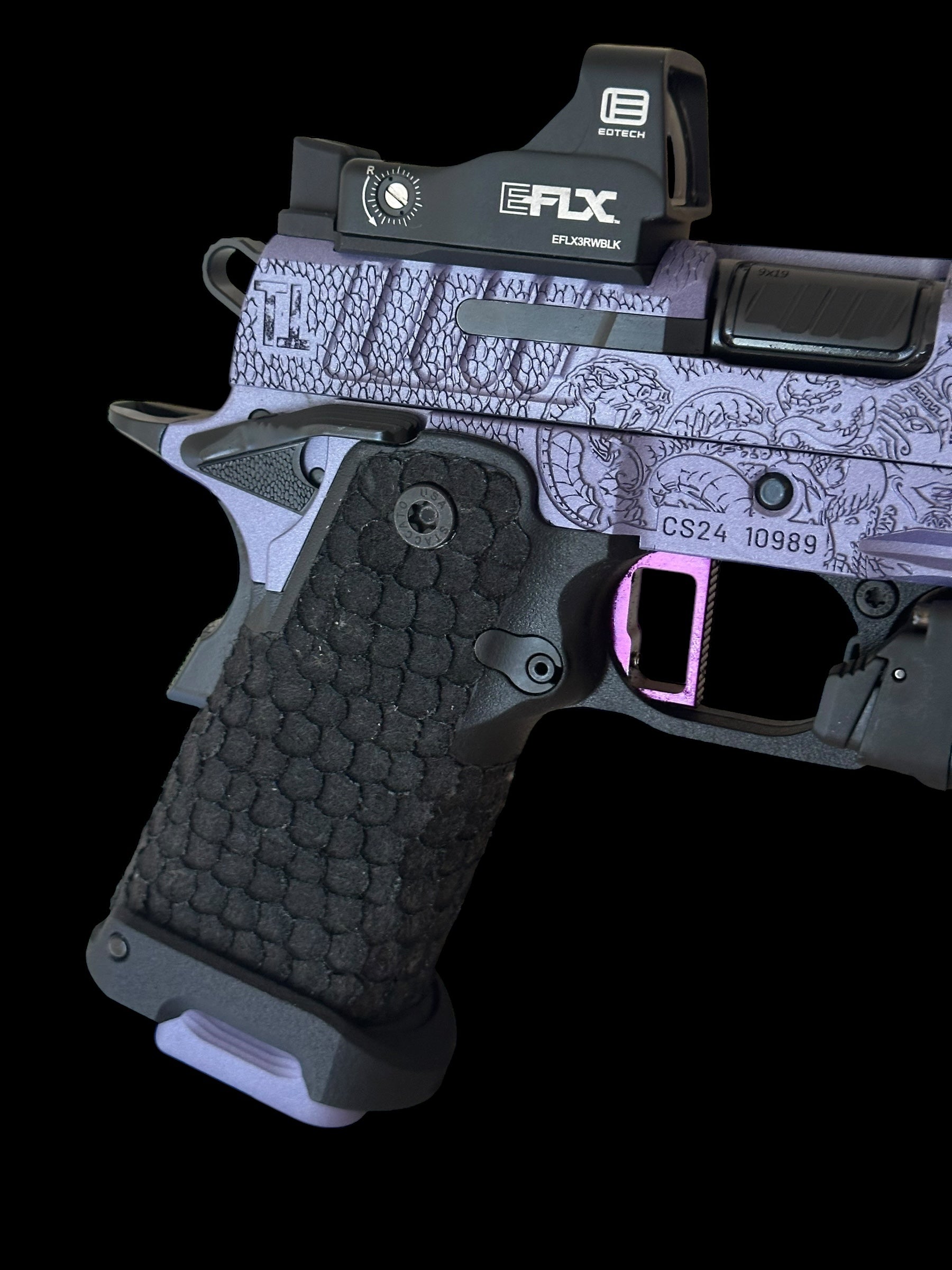 STACCATO CUSTOM CS X SERIES 3.5” PORTED BARREL “MEDUSA” ENGRAVED IN PURPLE/BLACK FINISH.