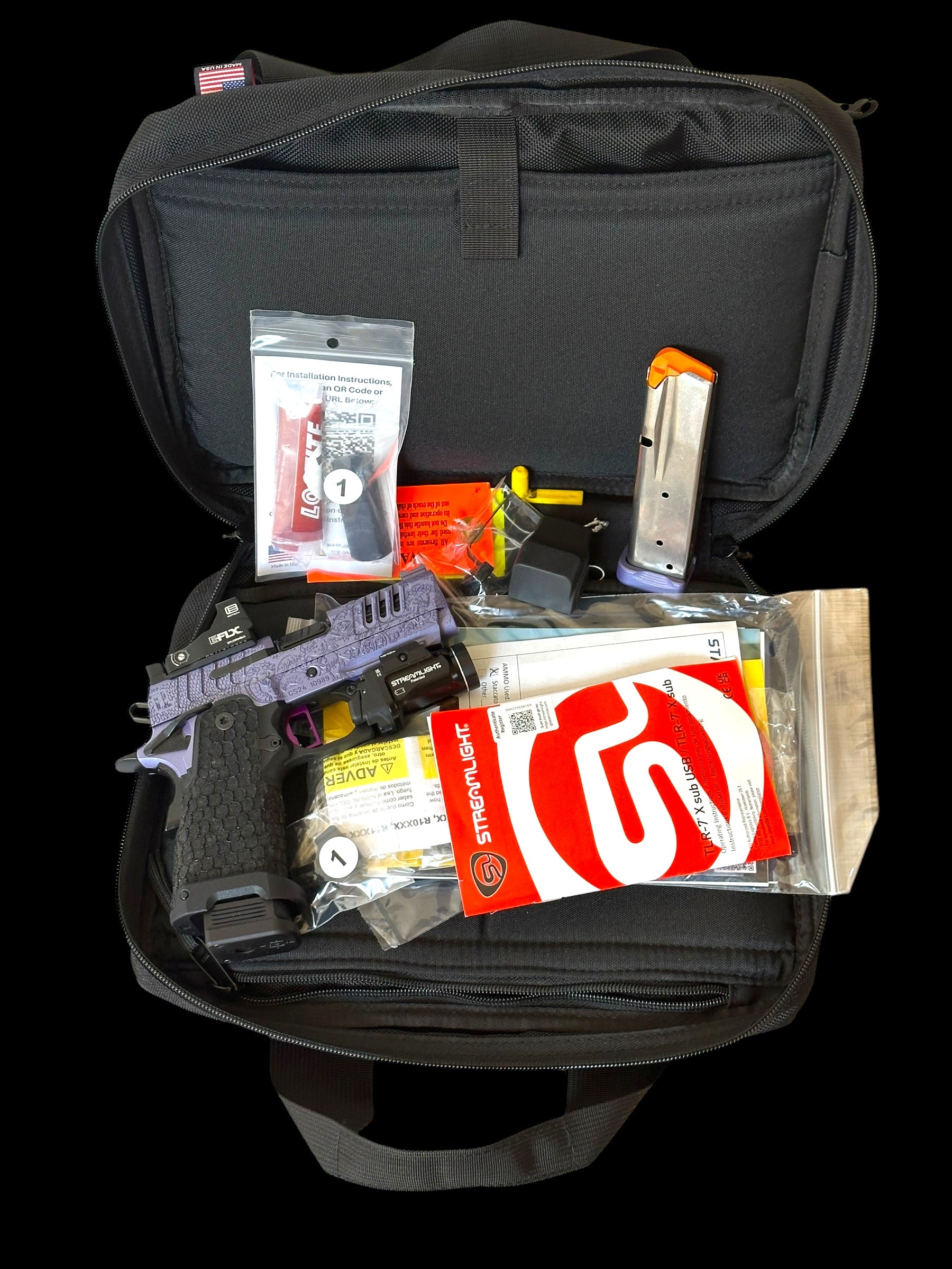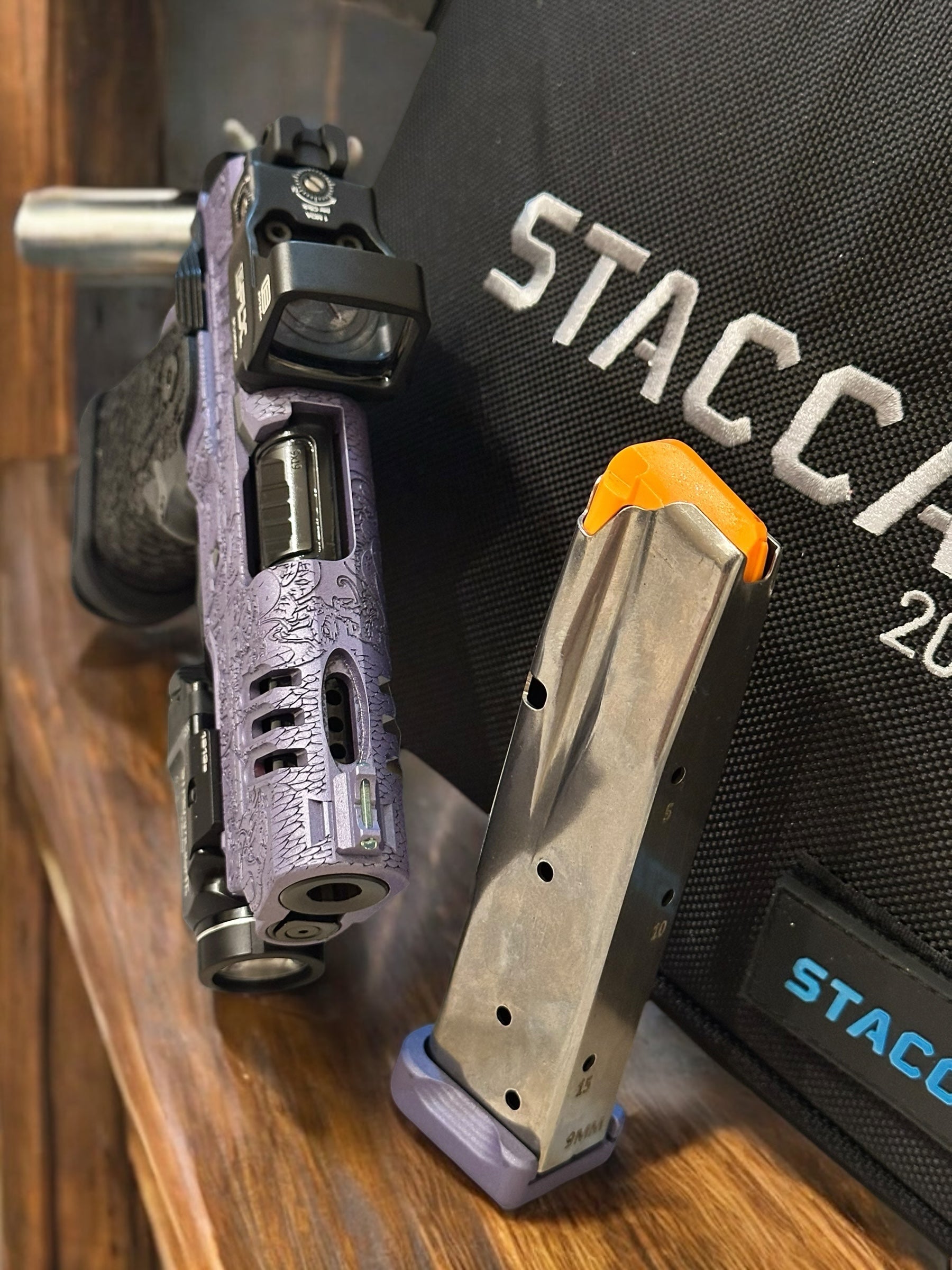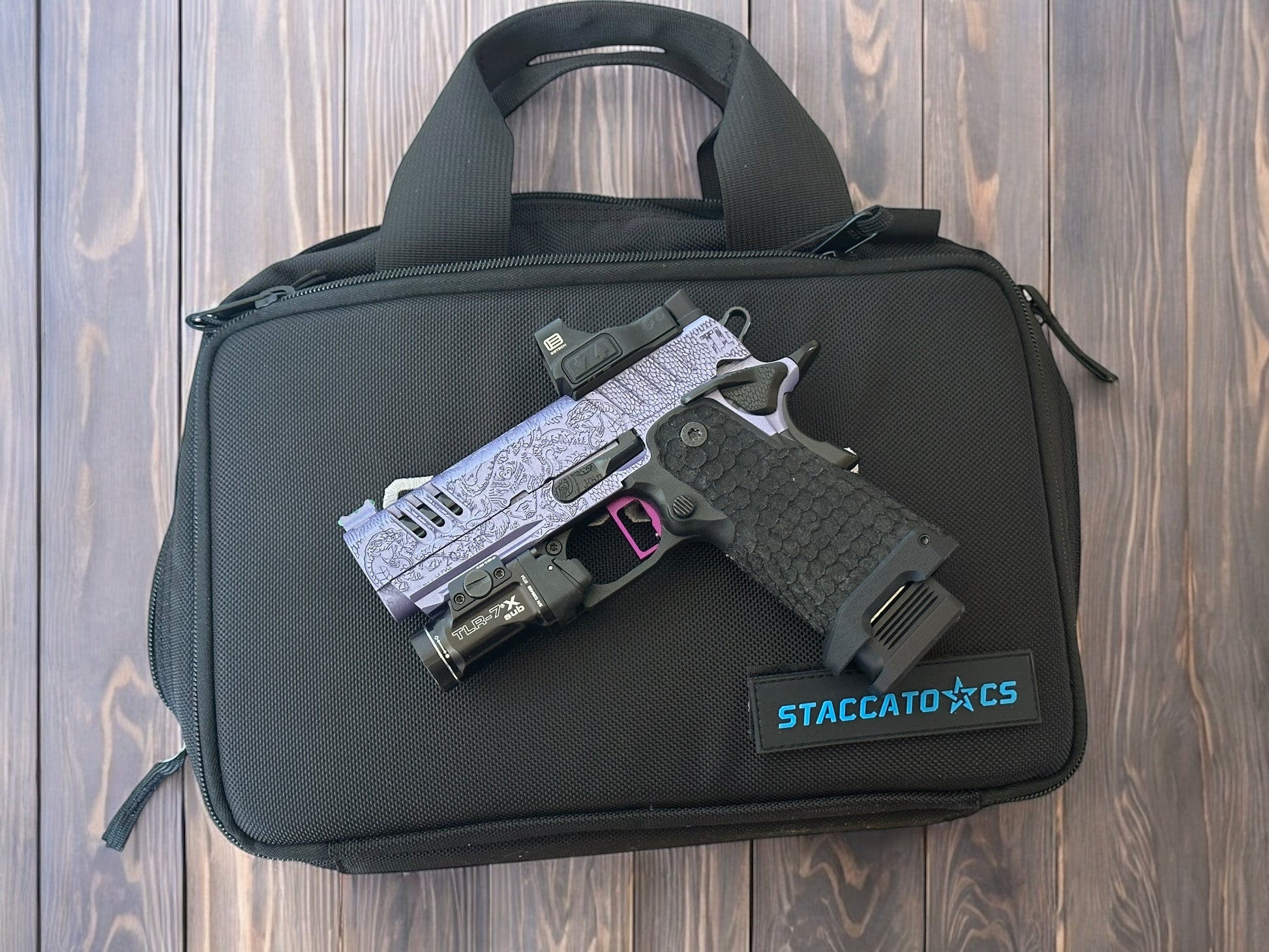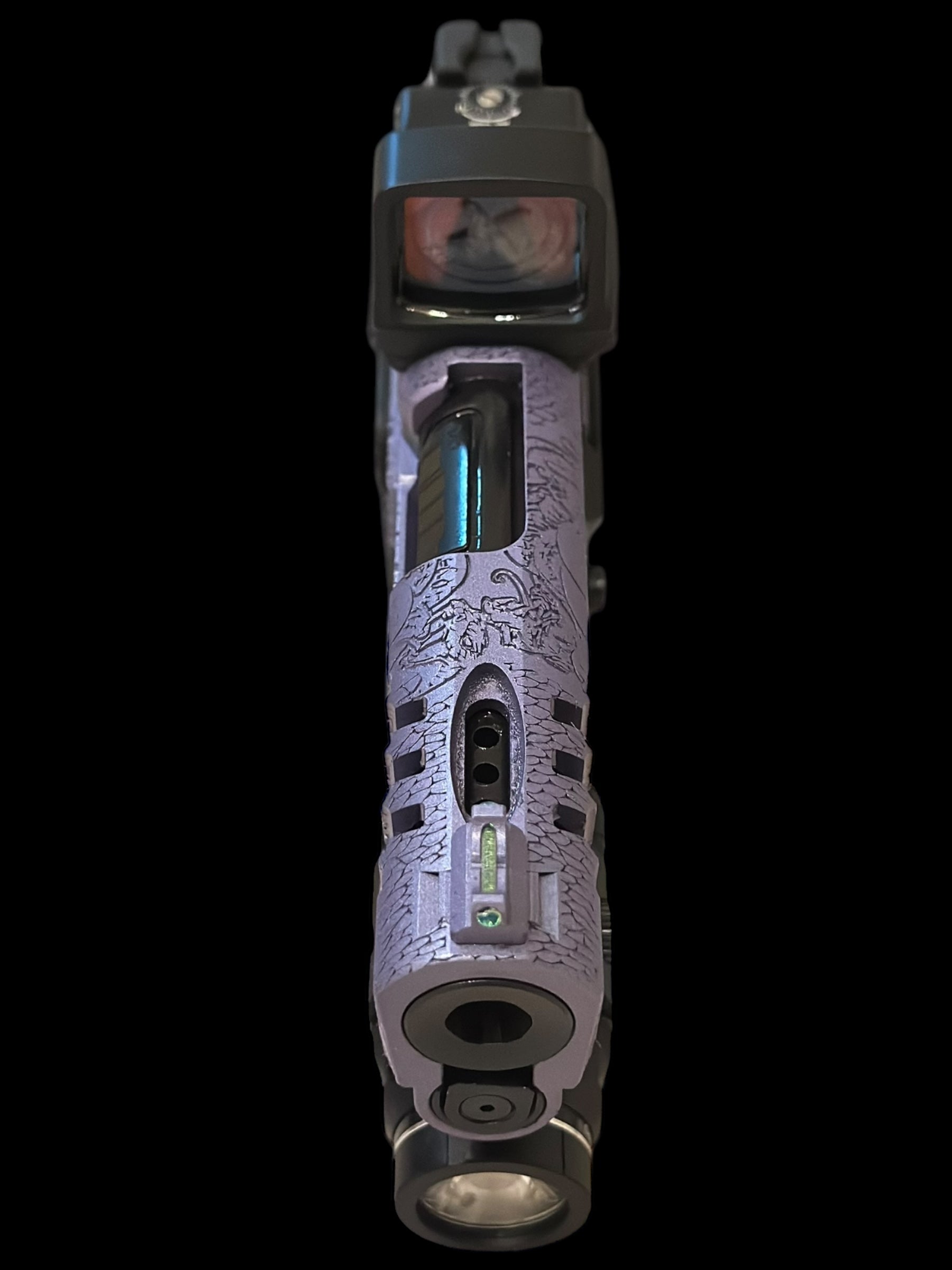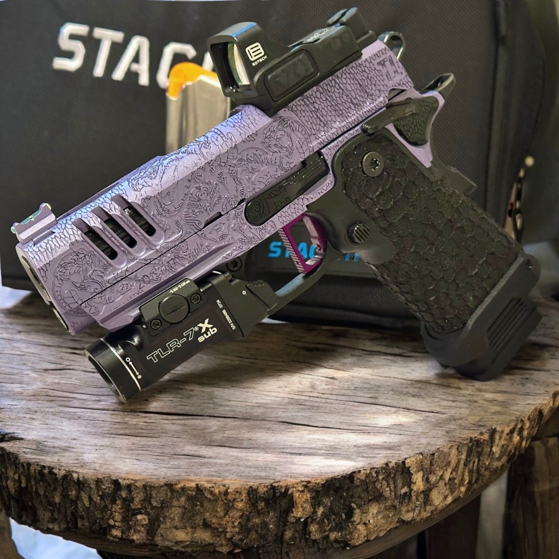 STACCATO CUSTOM CS X SERIES 3.5” PORTED BARREL “MEDUSA” ENGRAVED IN PURPLE/BLACK FINISH.