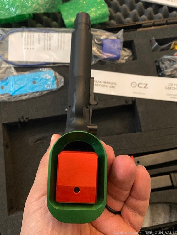 This competition semi-auto single-action pistol is a CZ 75 TS CzechMate Parrot chambered in 9MM Luger. This pistol is a factory blem and carries a full warranty on the mechanical. The Czechmate Parrot comes fully loaded with all the goodies you'd expect to compete in International Practical Shooting Confederation (IPSC) Limited or Open division competitions. Everything on this semi-automatic is in the right place. This is a very serious competition pistol. That's reflected in the impressive feature list. The gun is designed for International Practical Shooting Confederation (IPSC) Limited or Open division competitions, and it comes out of the box set up for the latter. Thus, it has a four port compensator to thrust the muzzle down during firing and C-MORE 6-MOA red dot optical Slide Ride sight that mates directly and solidly to the slide without any additional mounting hardware. For IPSC Limited competitions, there is a front sight adapter to use in lieu of the compensator and an included rear sight as well. The slide has an ambidextrous slide racker in back. It also has six slide stops: two are with slide lock and four stops are without. The beavertail is optimized for a high grip. Above it is a skeleton competition hammer. The gun has an ambidextrous thumb safety in back and a safety stop on the hammer too. The trigger guard has a vertical front face with subtle horizontal serrations, a bulging belly and ends in a deep undercut by the grip. Inside, the competition single-action only trigger is long and straight with a bottom kick out that echoes the trigger guard forward face. The gun has aluminum grips and the magwell is also aluminum. The cold hammer forged barrel is 5.23" long. This pistol comes from the factory with all tools, C-More Red Dot Sight and mounting hardware, three 20-round magazines, one 26-round extended magazine, Instruction manual, extra recoil spring, speed loader, compensator, oil, purple cocking lever, extra slide stop, extra slide stop pins, and a host of other hardware. The gun comes with a rugged and much appreciated CZ hard case.
