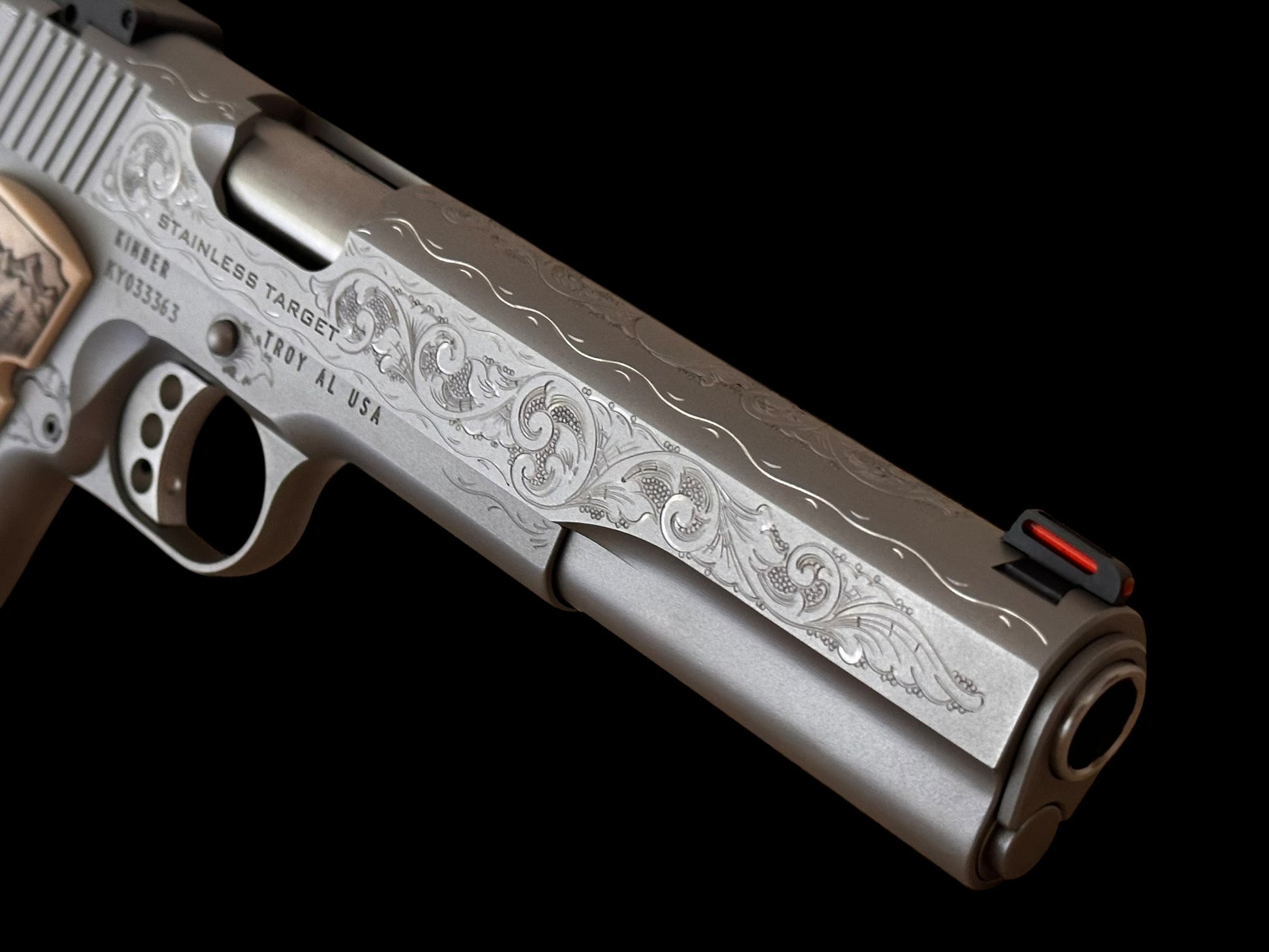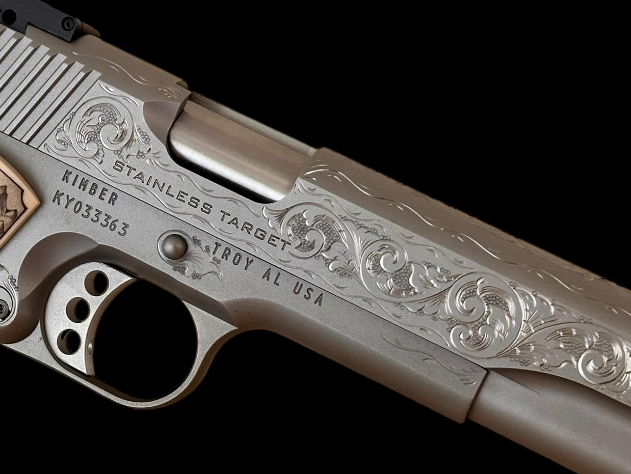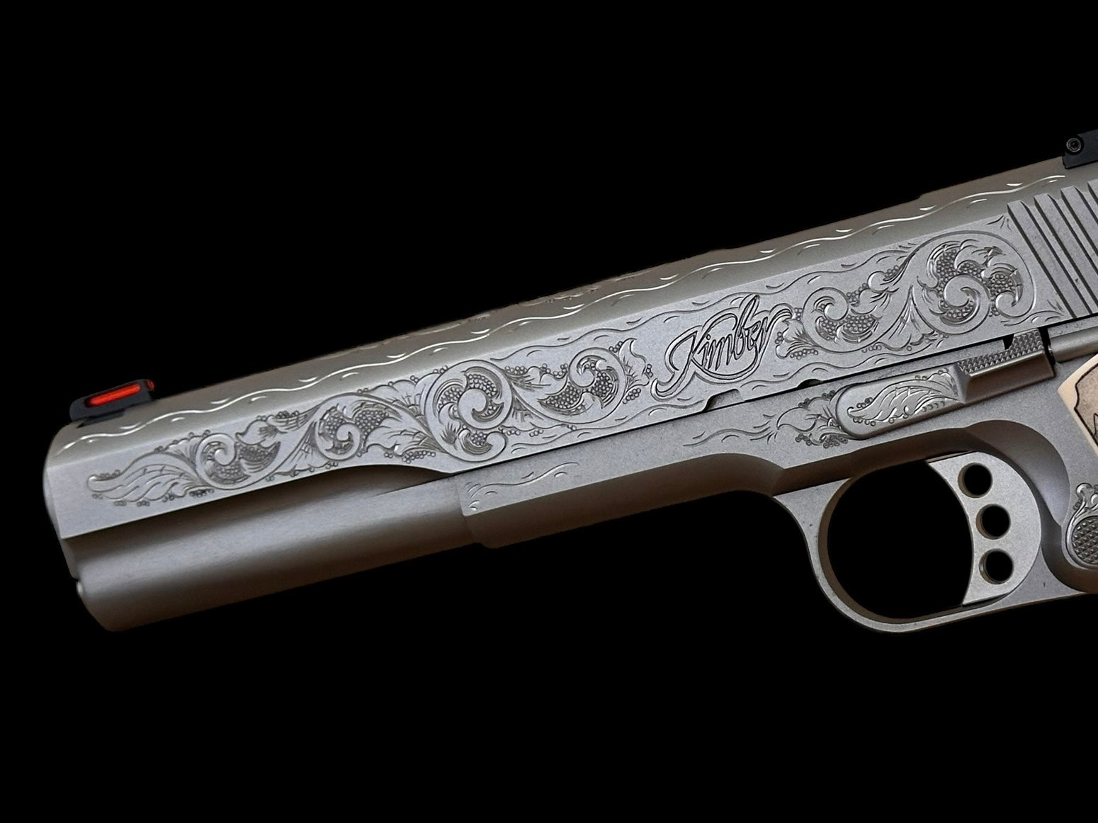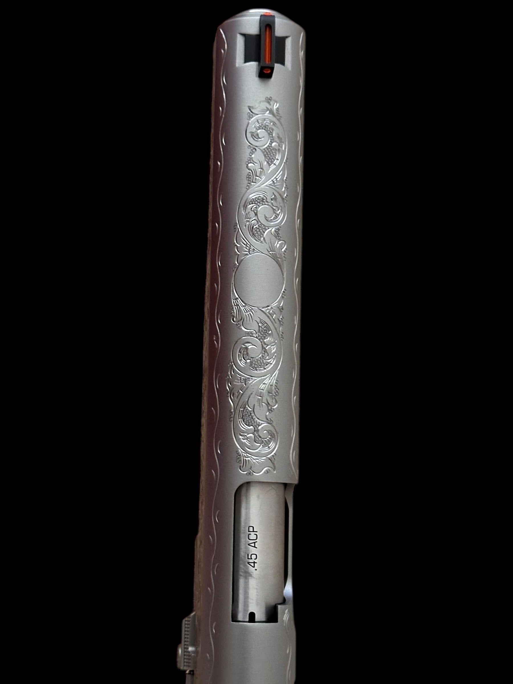 Kimber 1911 Stainless Target long slide hand engraved with custom grips. .45acp