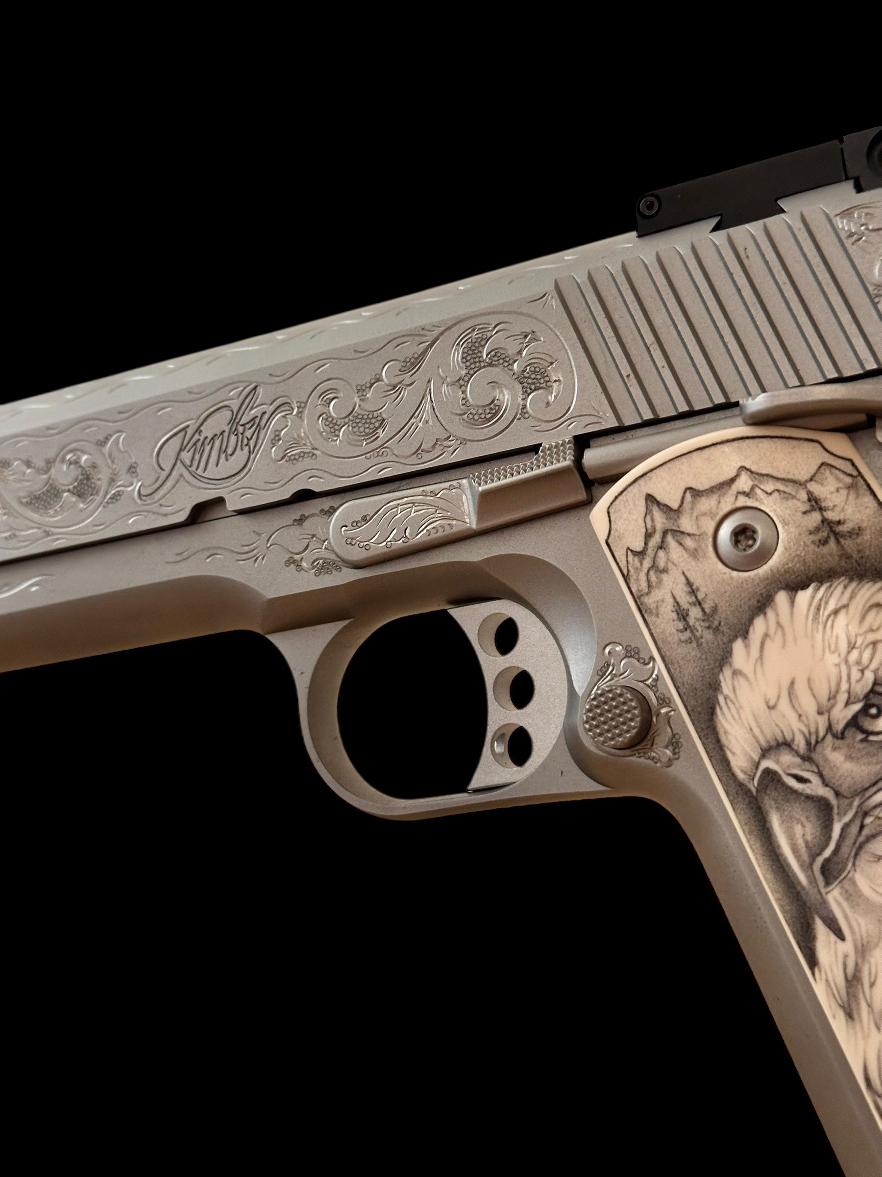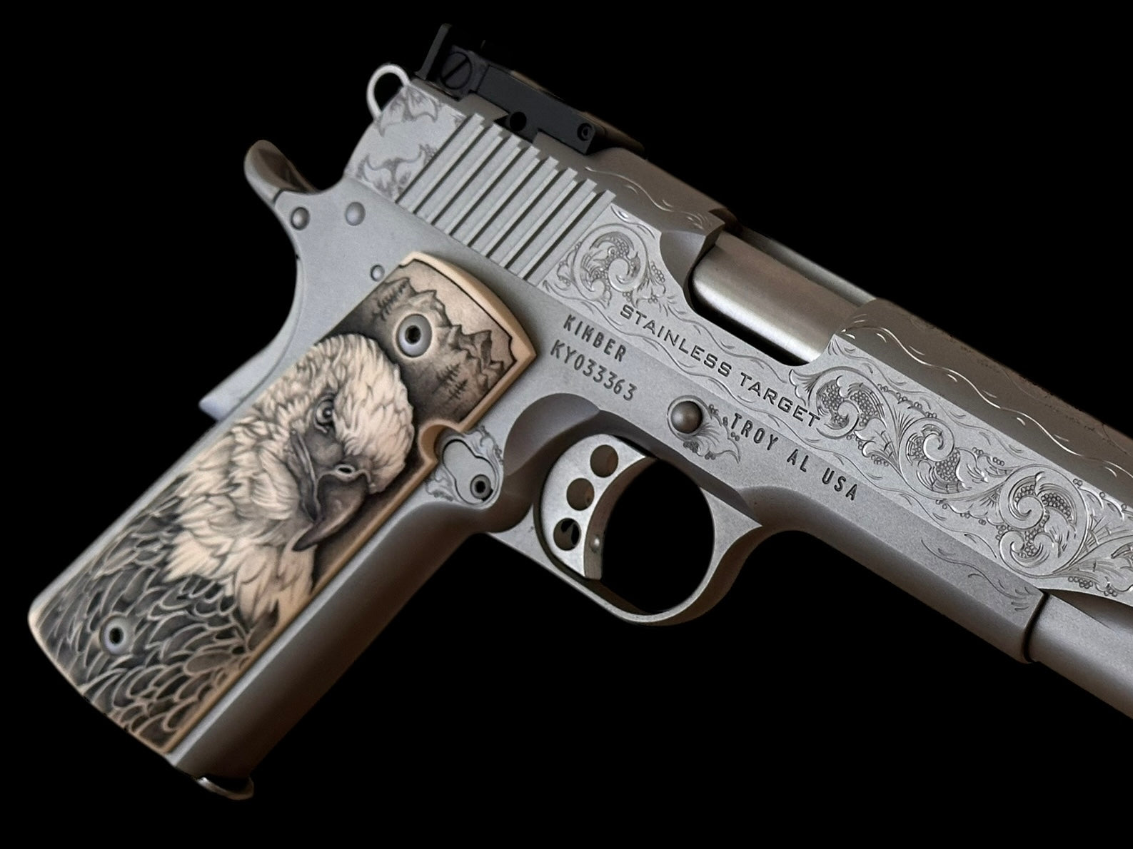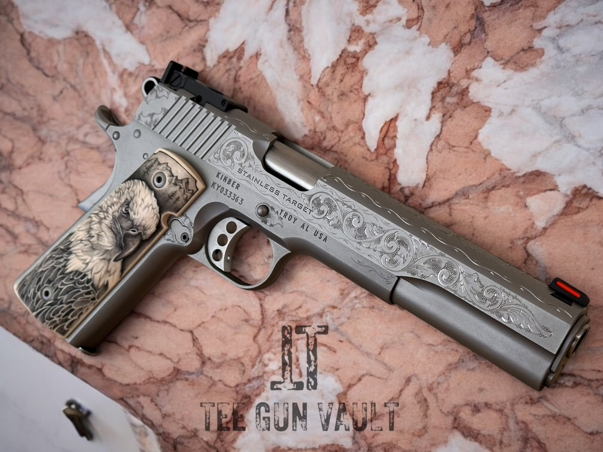 Kimber 1911 Stainless Target long slide hand engraved with custom grips. .45acp
