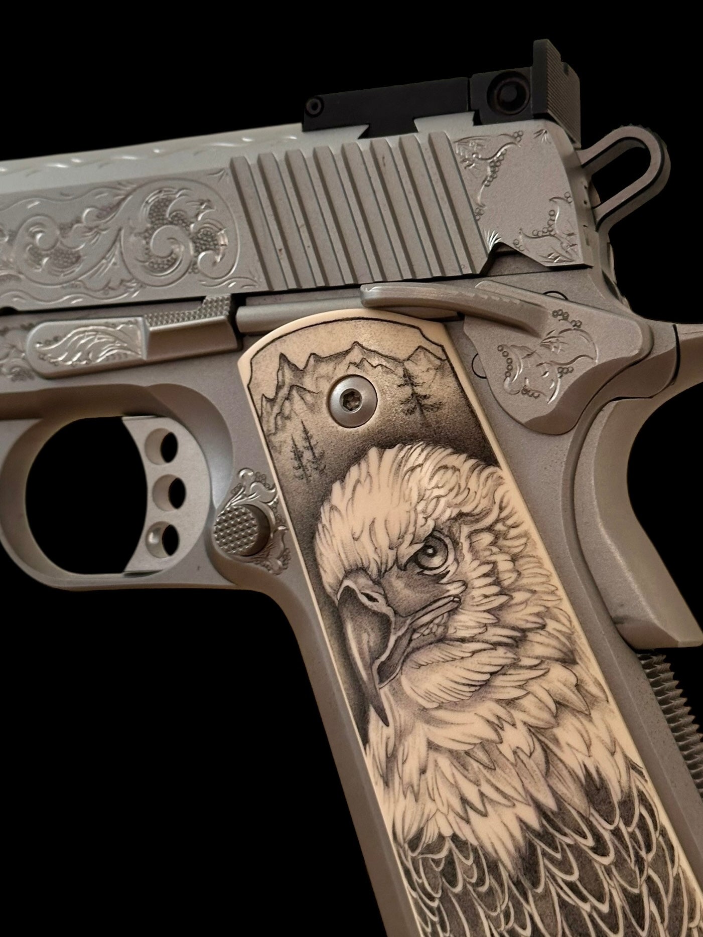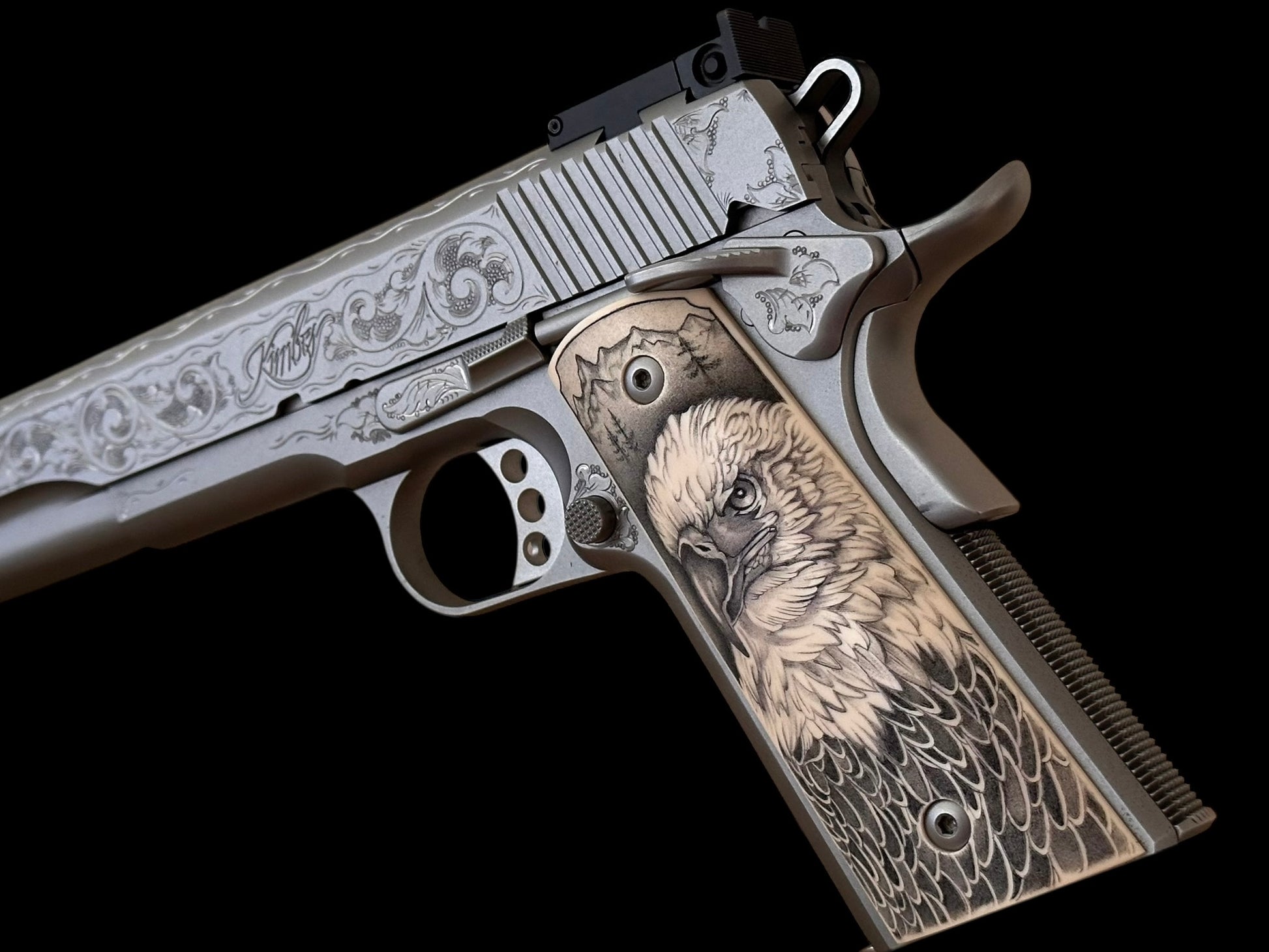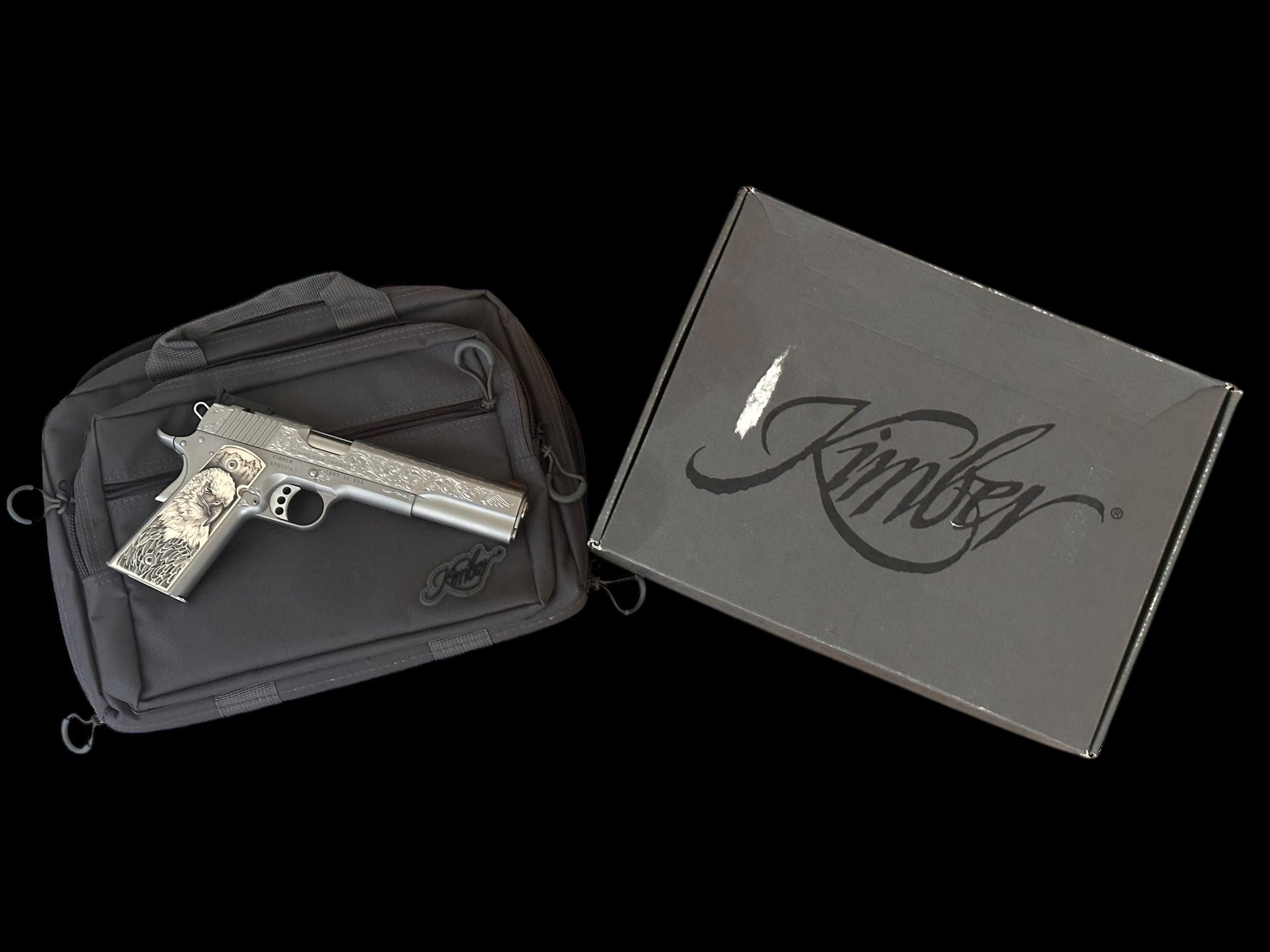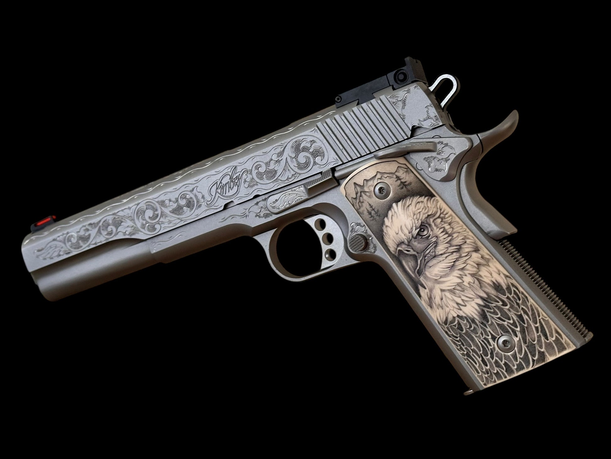 Kimber 1911 Stainless Target long slide hand engraved with custom grips. .45acp