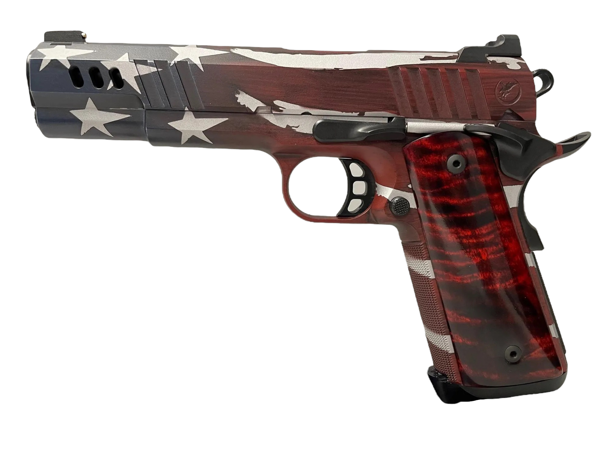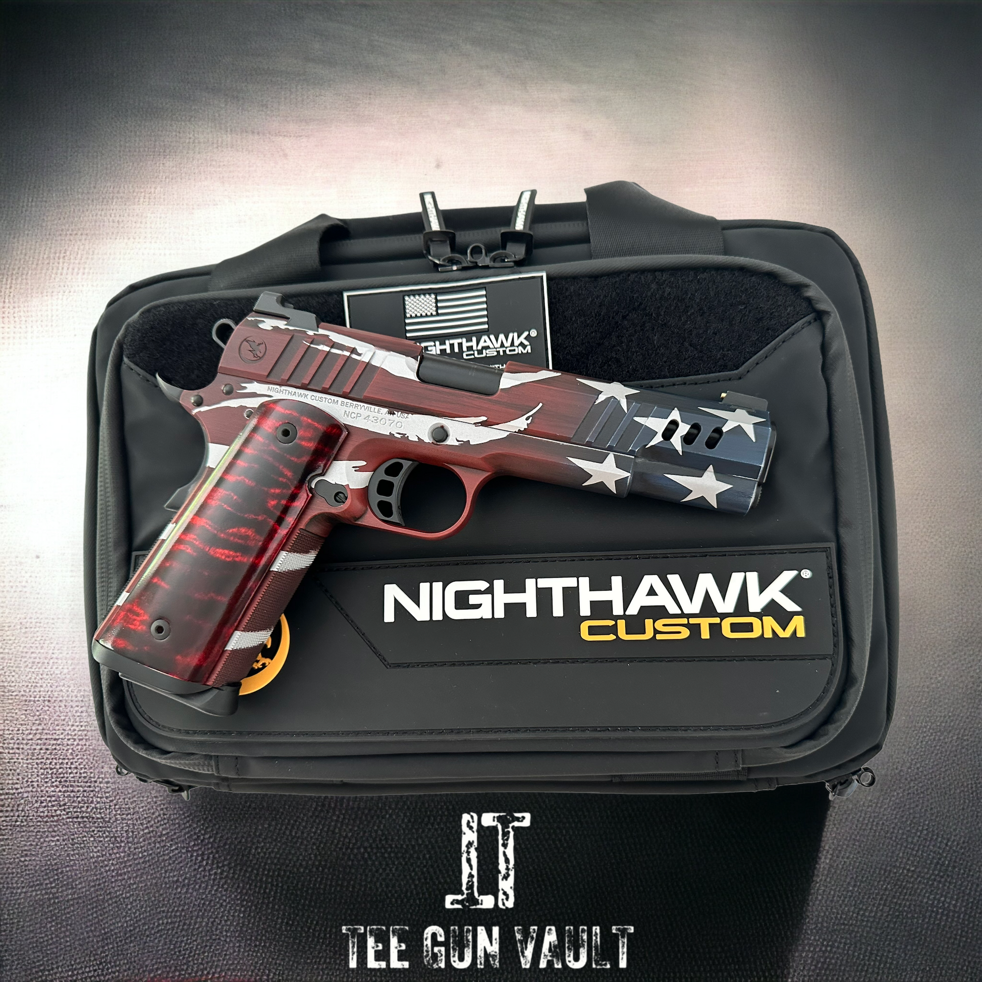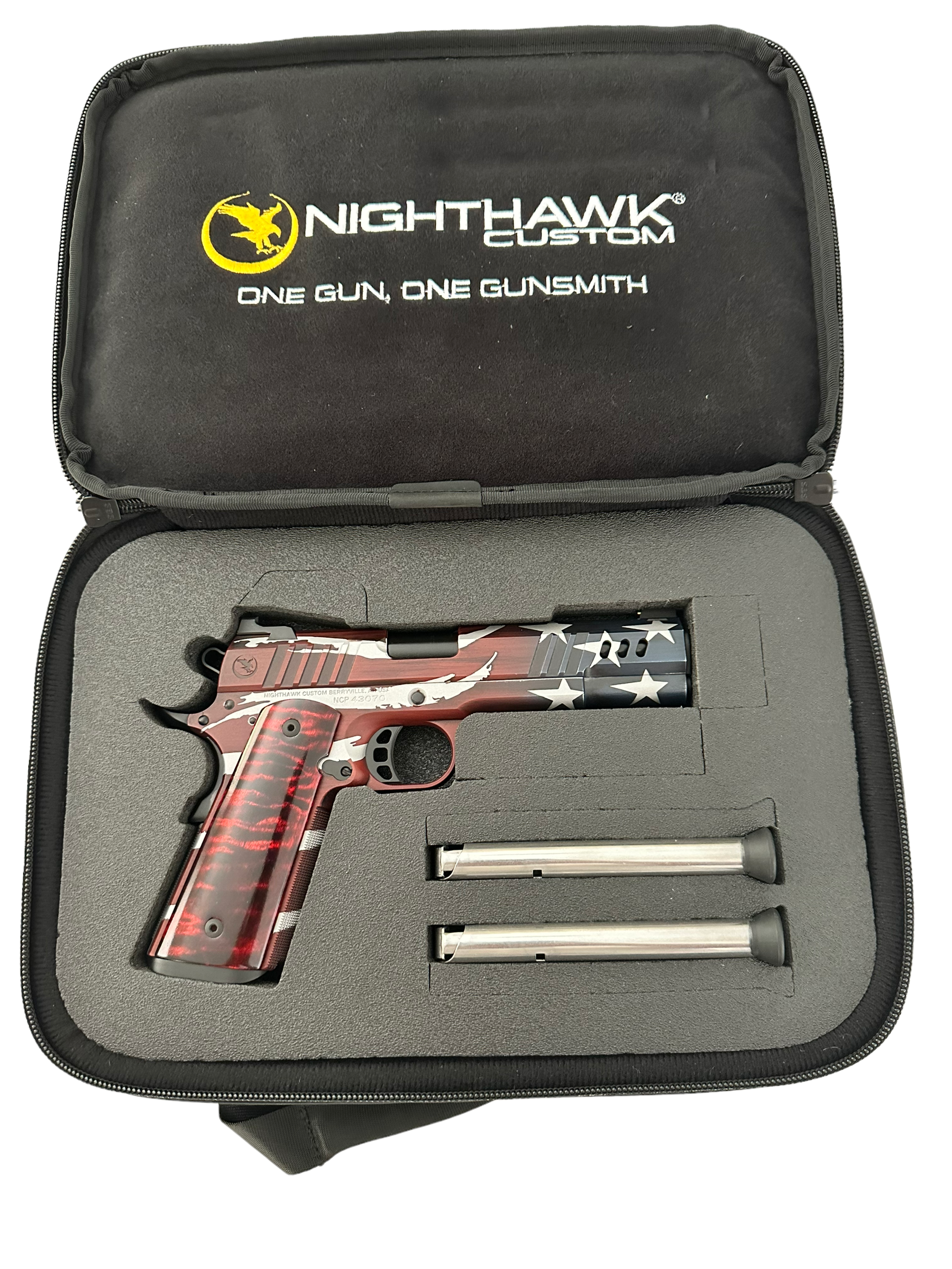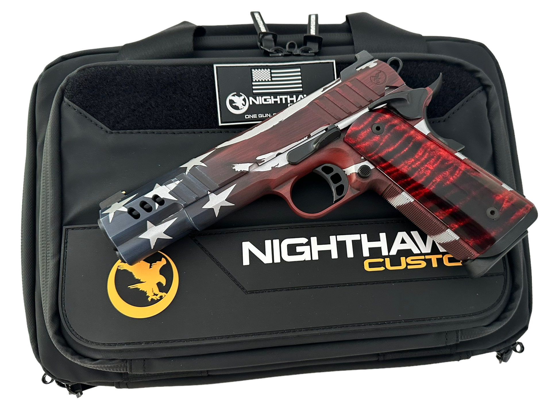 Finish: Custom American Flag theme Cerakote Finish Forged government size frame and 5" barrel Match grade 9mm barrel Heinie Ledge solid black rear sight 14K solid gold bead front sight One-piece mainspring housing/magwell Custom Elder burl wood grips w/ Medallions (upgrade) Heavy angle, slide-lightening cuts 25 lines per inch checkered front strap and mainspring housing Lightweight aluminum Nighthawk Custom tri-cavity trigger Crowned barrel flush with bushing Checkered recoil spring plug Completely dehorned for comfortable carry Ultra hi-cut front strap