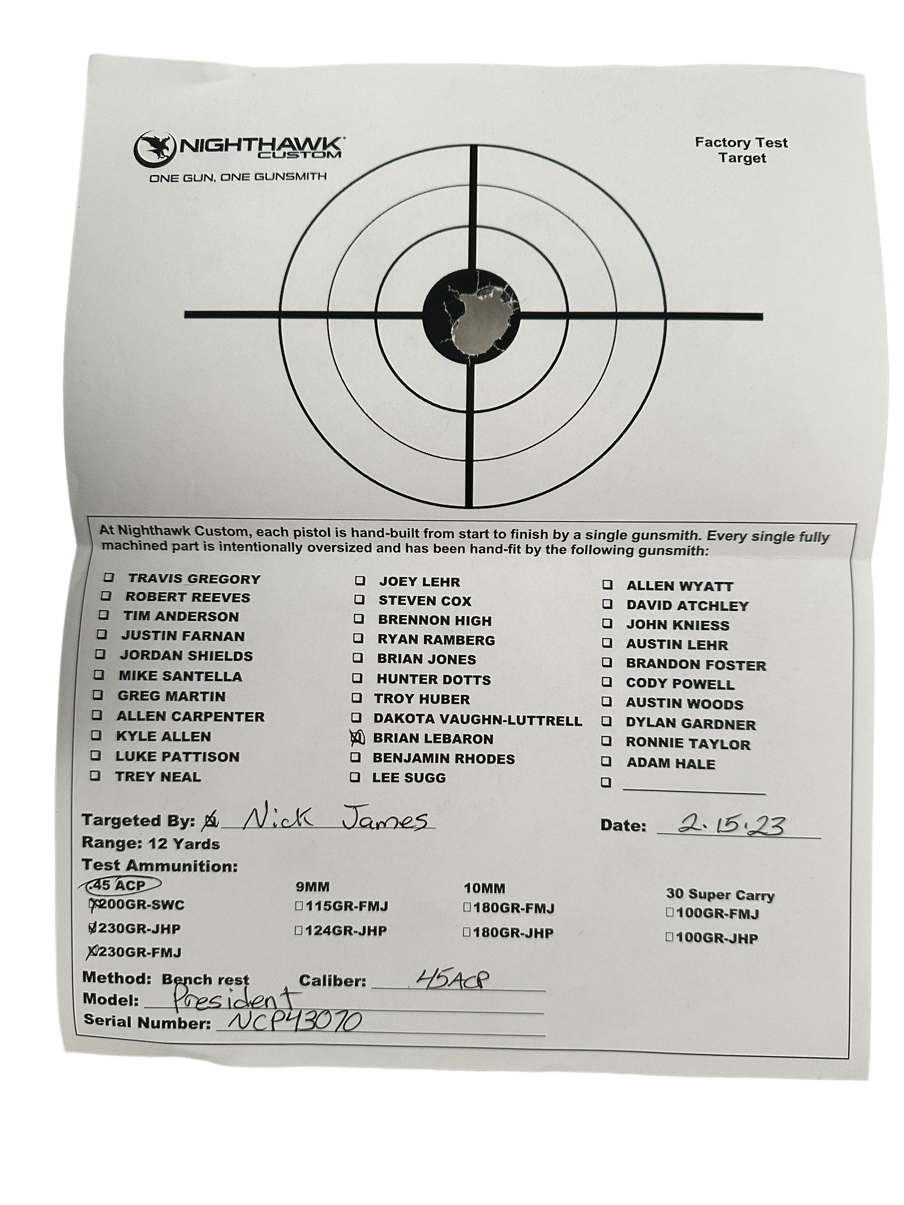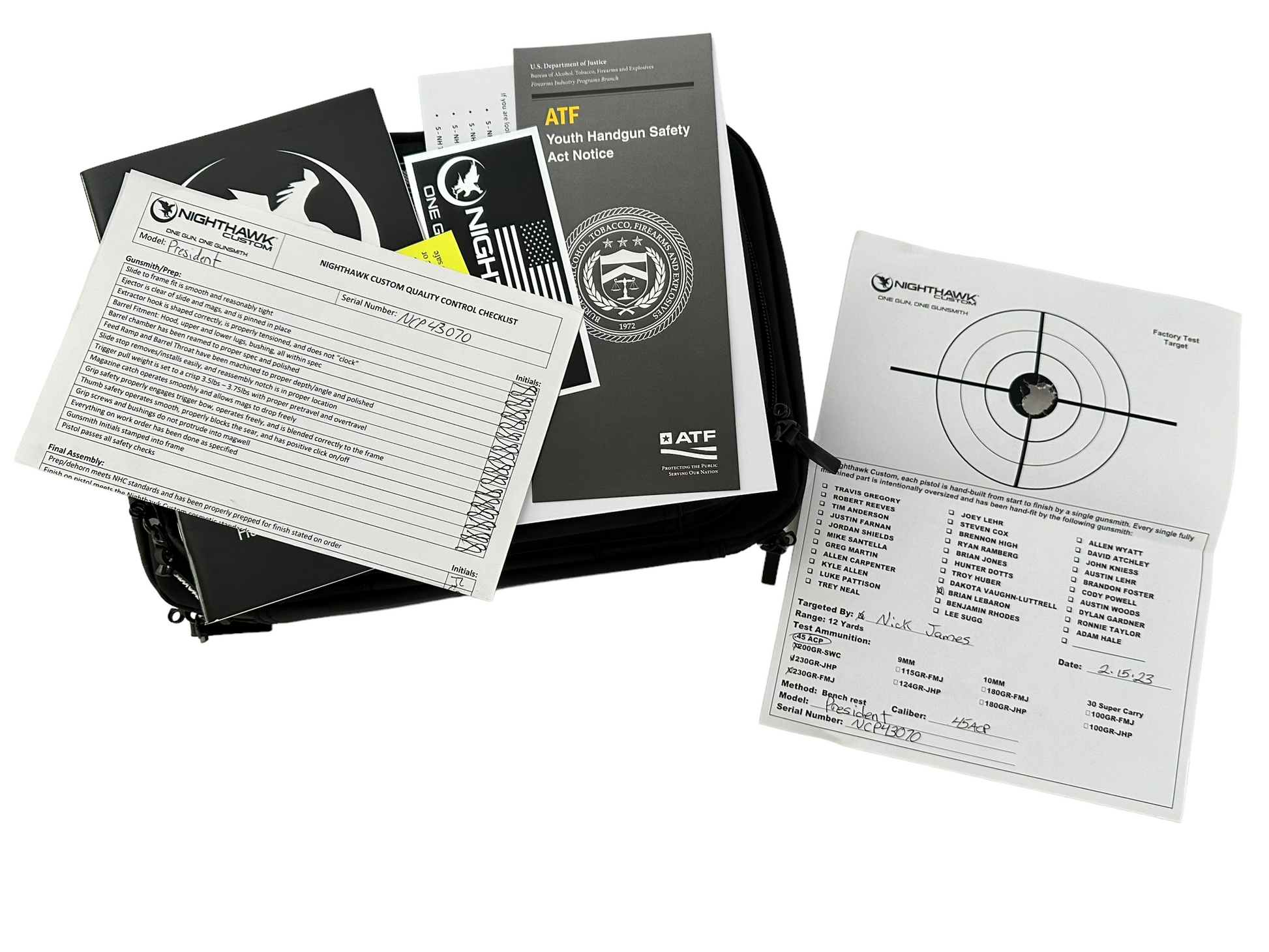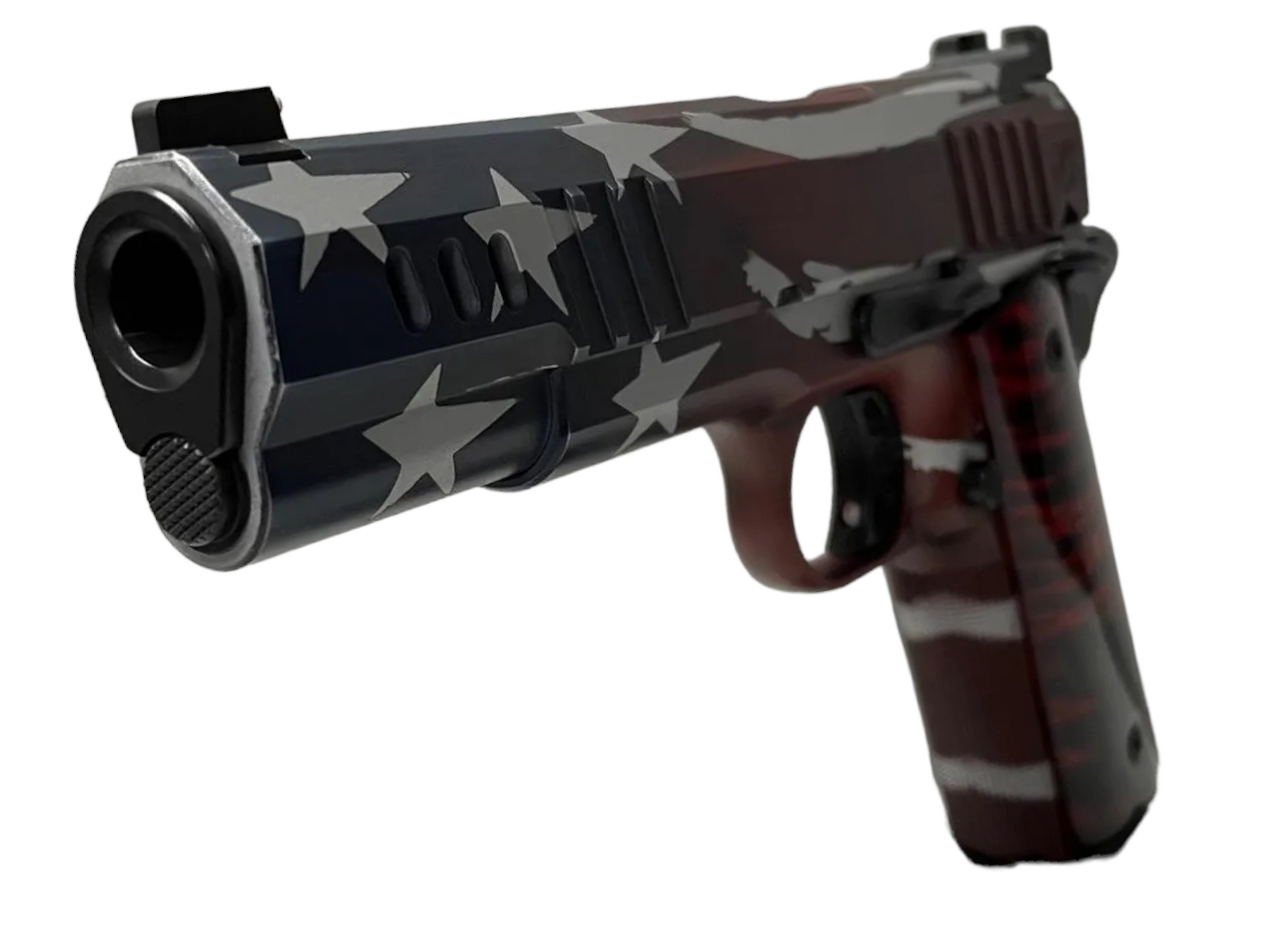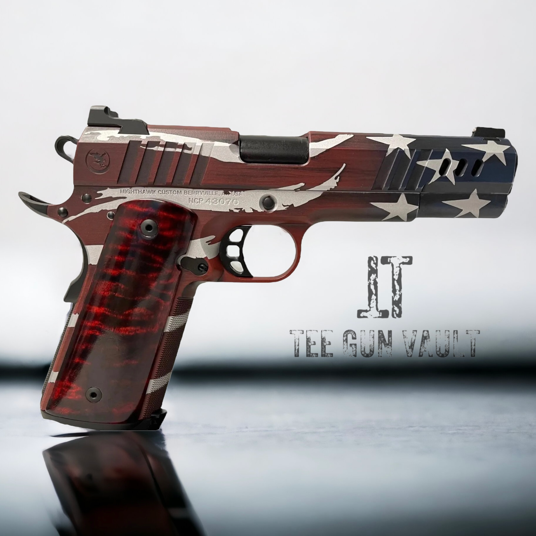 Finish: Custom American Flag theme Cerakote Finish Forged government size frame and 5" barrel Match grade 9mm barrel Heinie Ledge solid black rear sight 14K solid gold bead front sight One-piece mainspring housing/magwell Custom Elder burl wood grips w/ Medallions (upgrade) Heavy angle, slide-lightening cuts 25 lines per inch checkered front strap and mainspring housing Lightweight aluminum Nighthawk Custom tri-cavity trigger Crowned barrel flush with bushing Checkered recoil spring plug Completely dehorned for comfortable carry Ultra hi-cut front strap