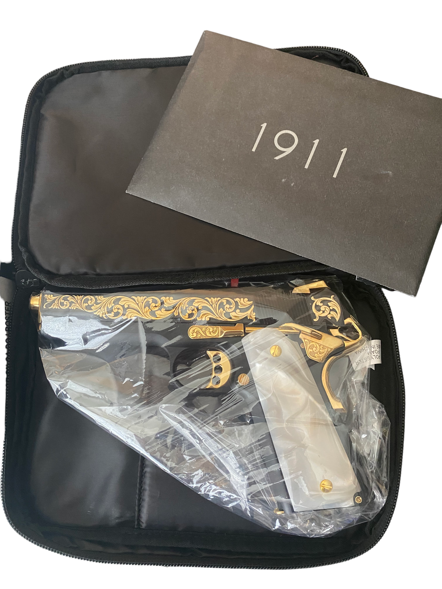 Brand new this beautiful 1911 Springfield garrison in deep blue finish with scroll engraving and 24k gold plated. White pearl grips.