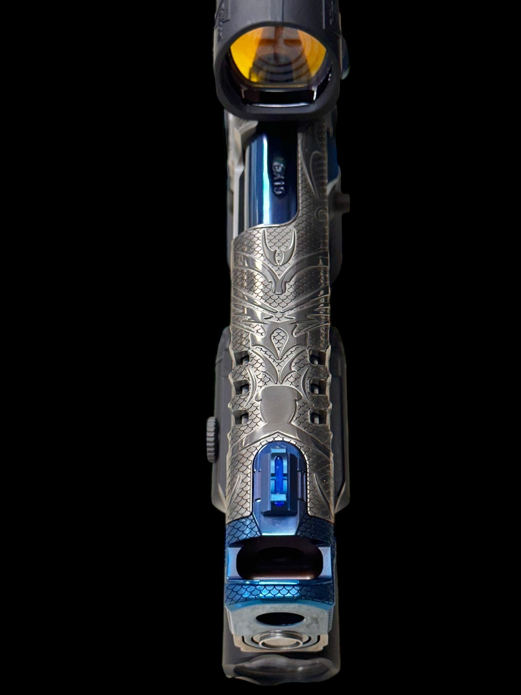 STACCATO CUSTOM XC “TRIBAL DRAGON” SILVER/BLUE PVD WITH ATLAS GRIPS SRO & X300 2 GRIPS
