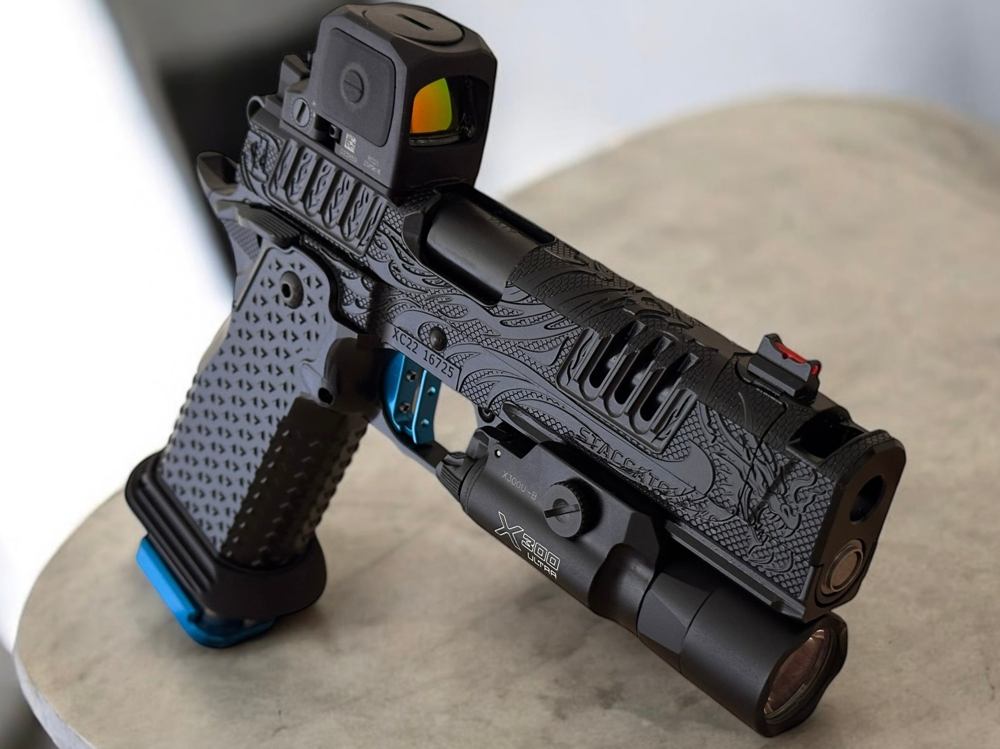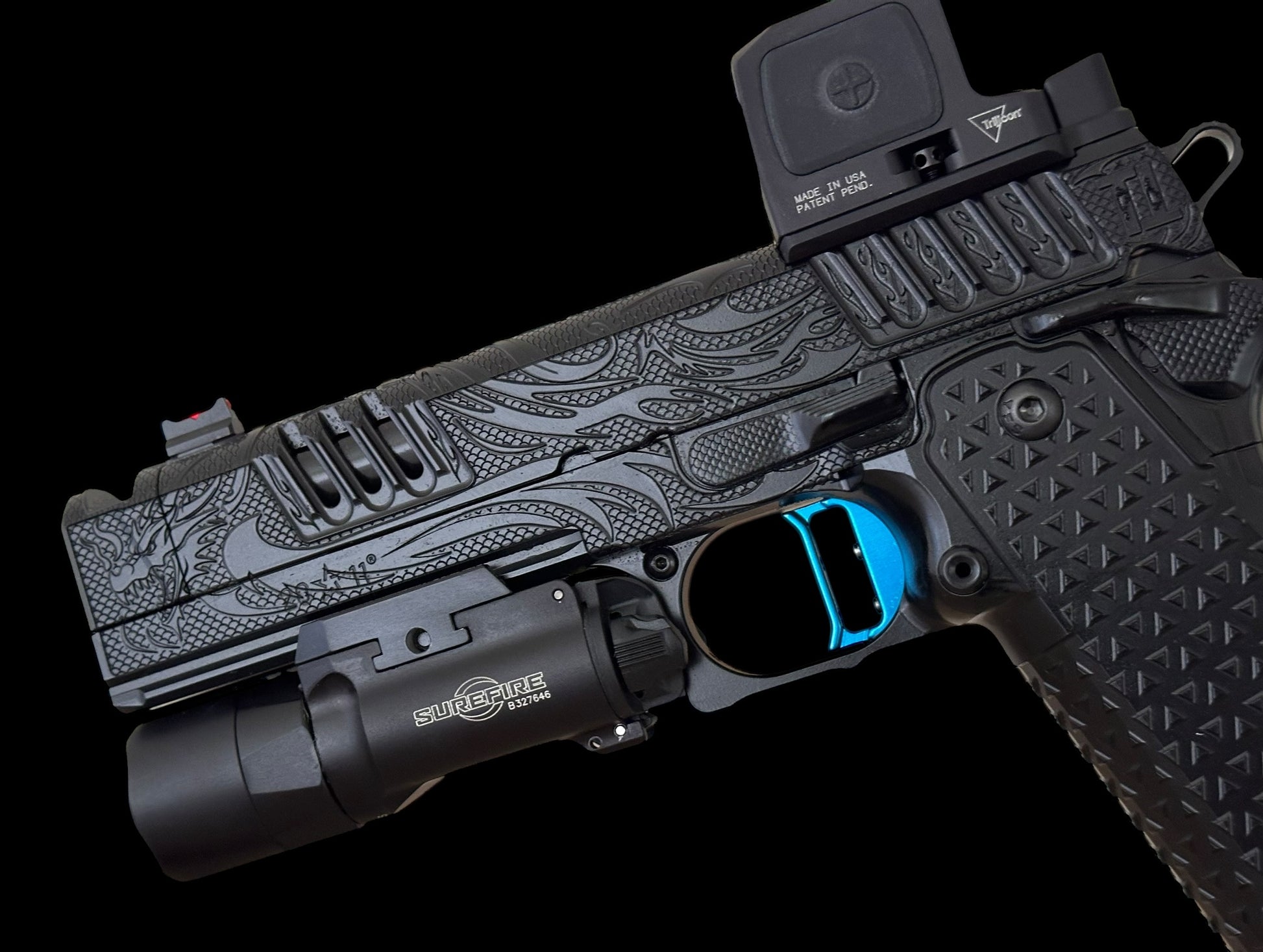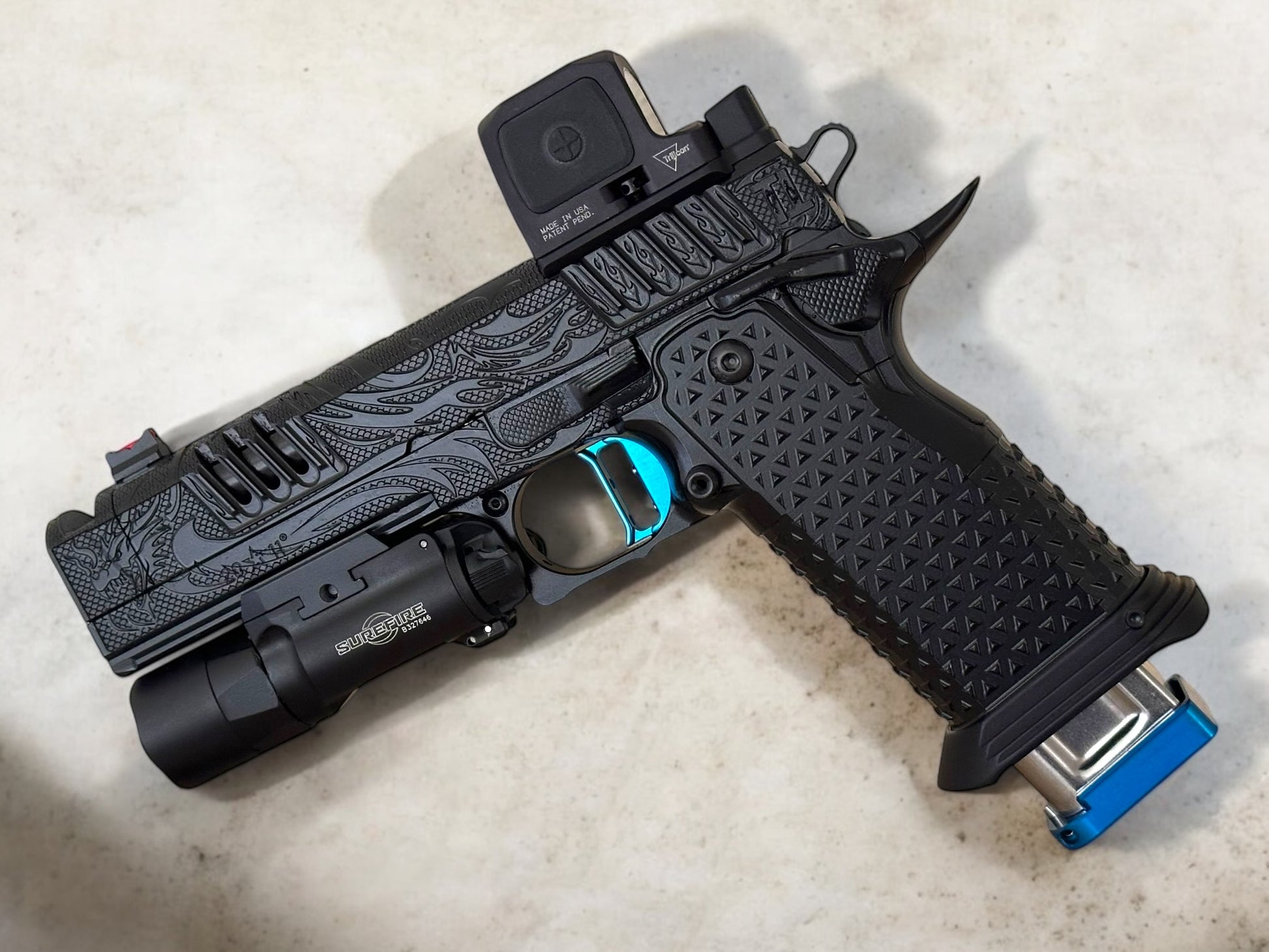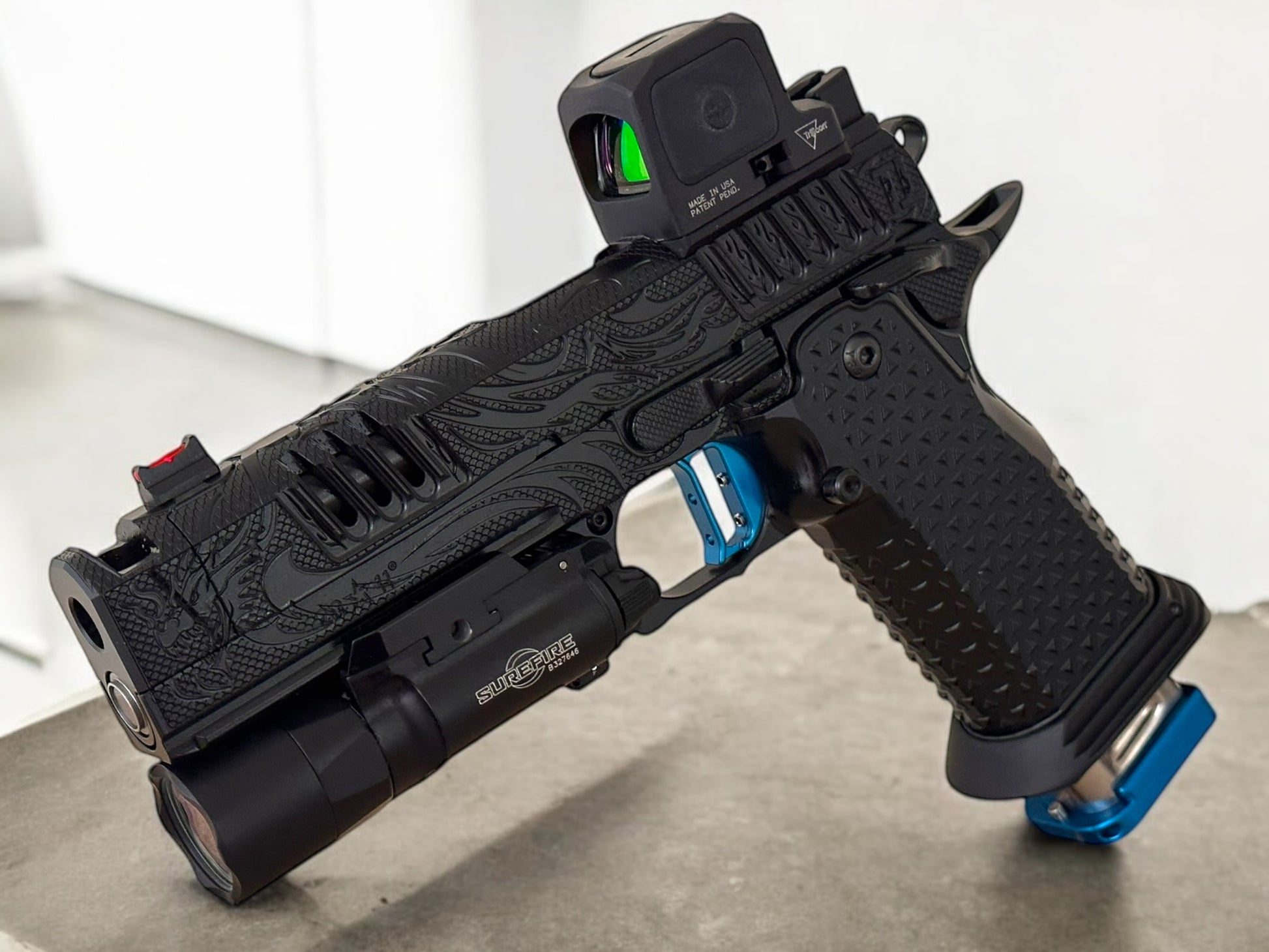 STACCATO XC CUSTOM “TRIBAL DRAGON BLACK” EDITION WITH ATLAS GRIPS / TRIGGER TRIJICON RCR AND X300