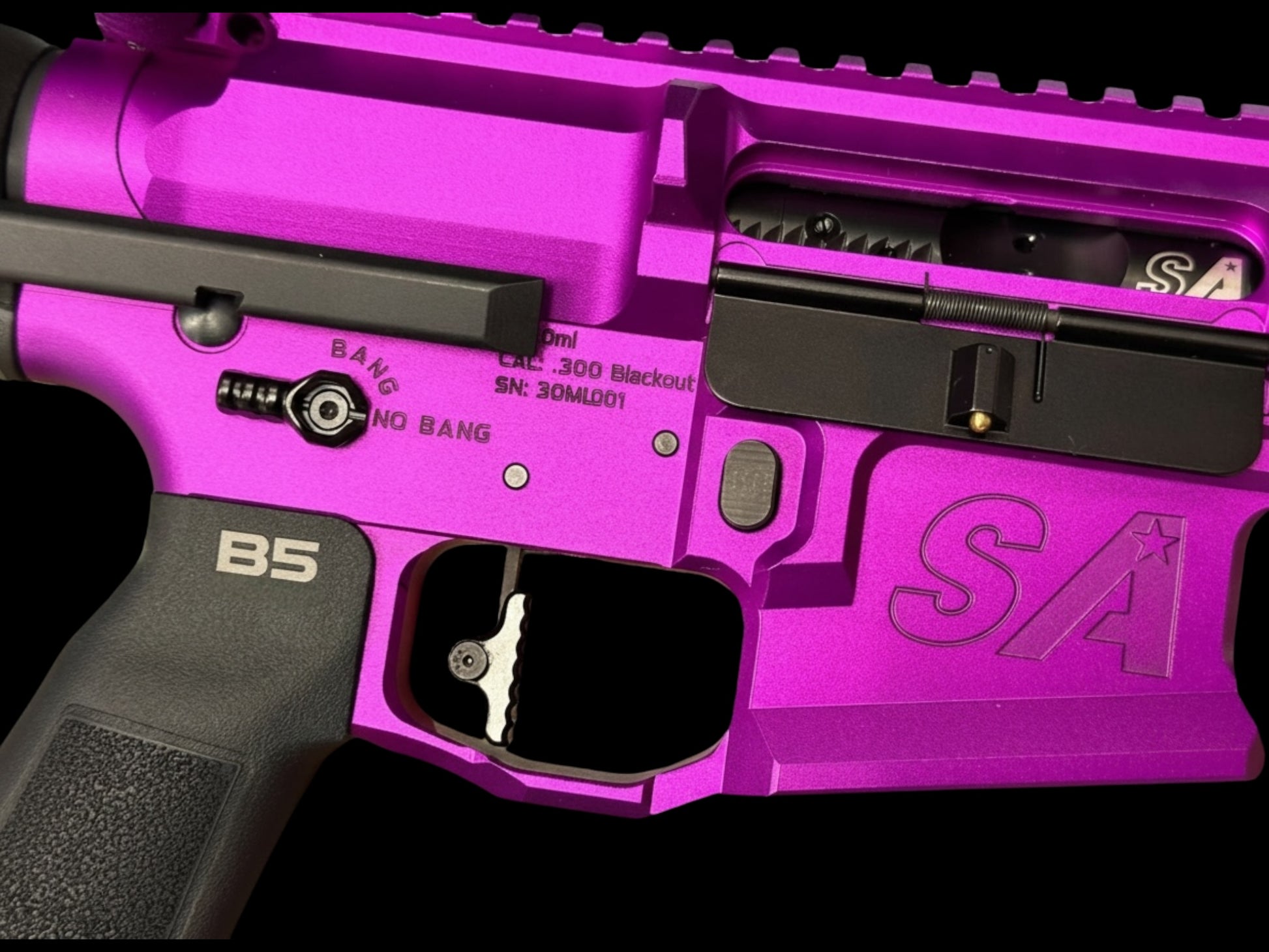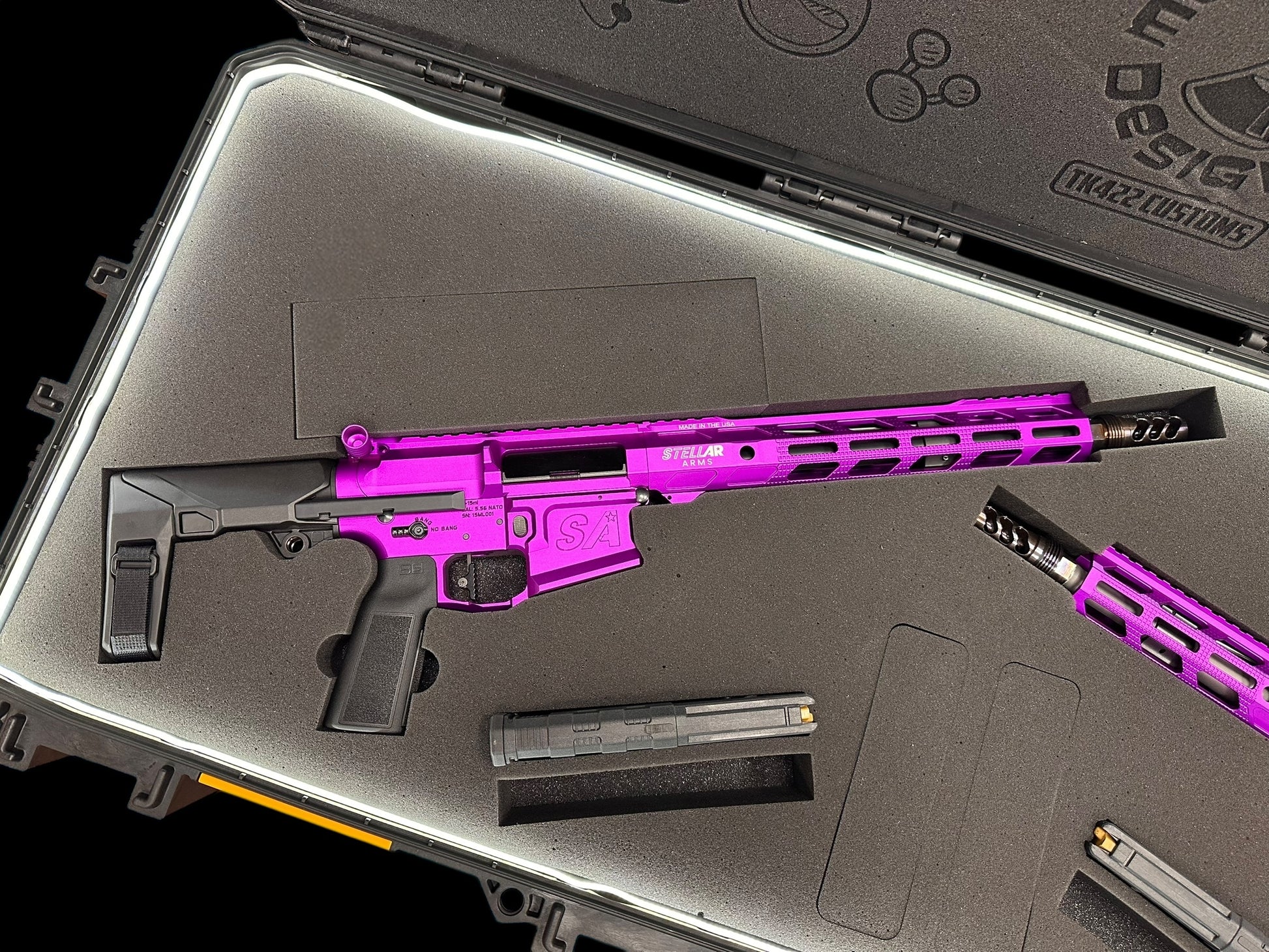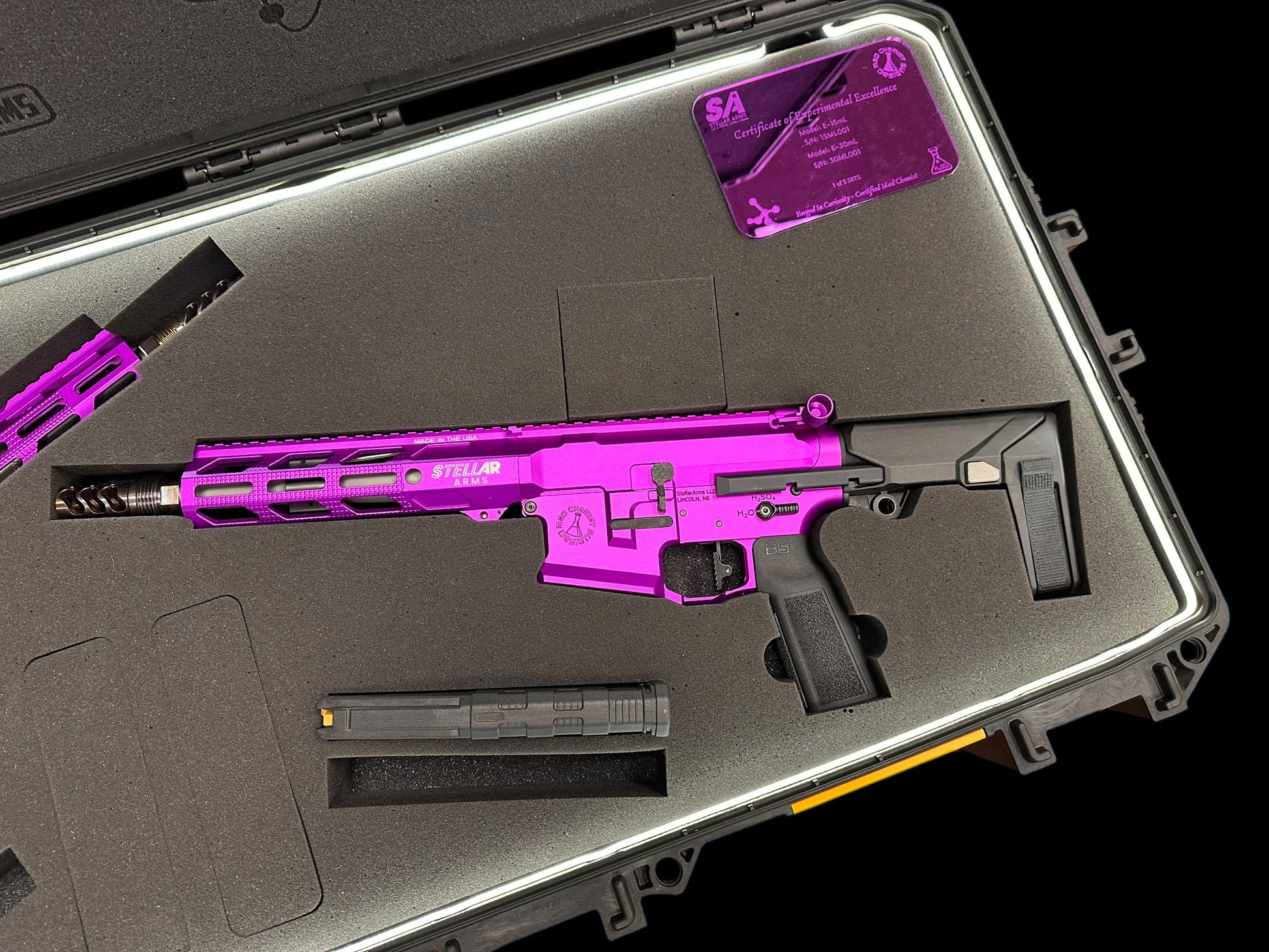 Forged from flight and chemistry, the Stellar × The Mad Chemist 12.3” 5.56 pistol and 8” blkout pistol merges Stellar’s aerospace machining with Mad Chemist’s signature surface style. Each unit features a CNC-machined 7075-T6 receiver set, Mad Chemist dimple-textured handguard with custom grip section, and a custom Stellar V6-QD brakefinished in gold heat treat.